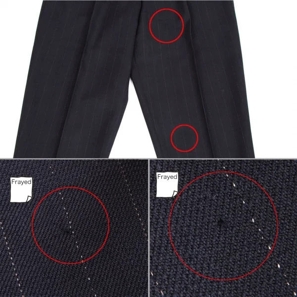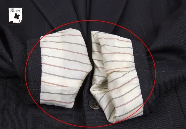 ジャケット:袖裏に汚れ、左袖に引っ掛けがあります。パンツ:ウエスト裏に薄汚れ、左足に引っ掛けがあります(画像参照)。その他目立ったシミ、汚れ、ほつれ等なくいい状態です。クリーニング済み