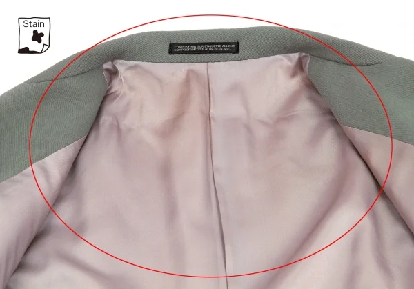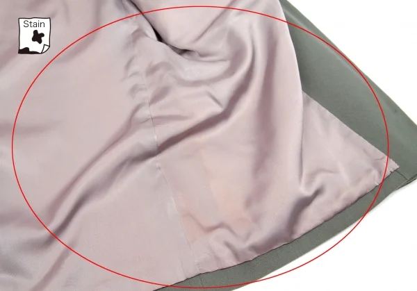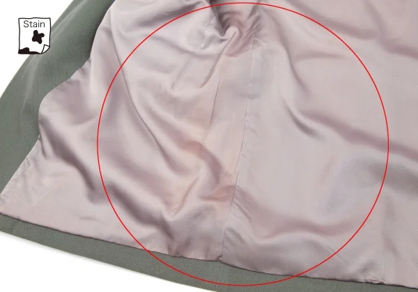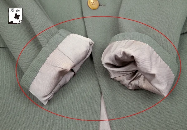 袖裏、裏地全体に変色あり。(写真参照)目立ったダメージはありません。クリーニング済み。