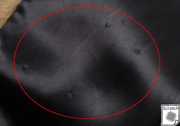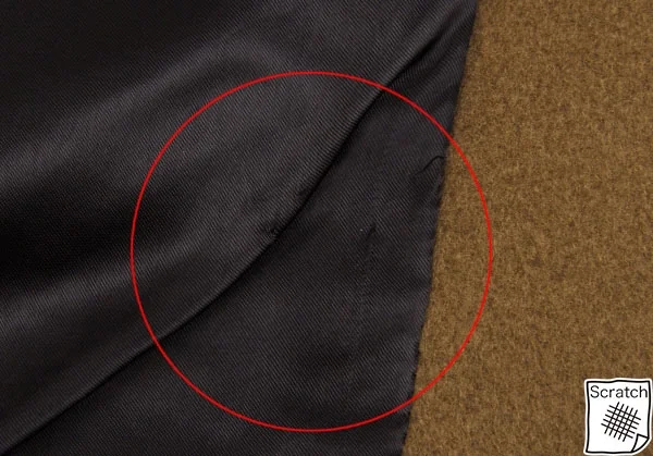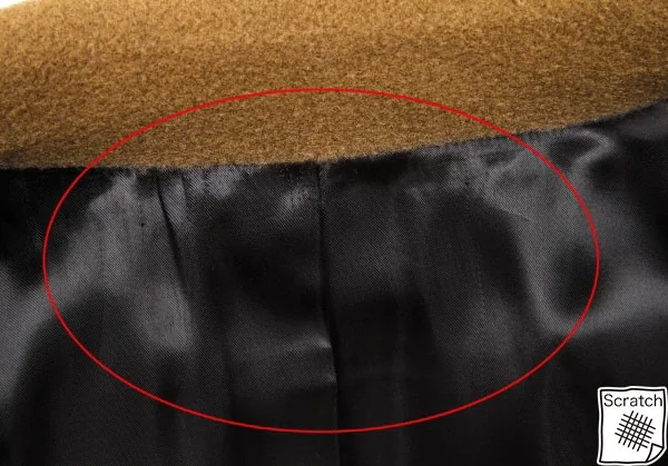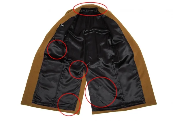 裏地に薄シミ、引っ掛け多数あり。後身頃に薄汚れあり。(写真参照)その他に目立ったシミ、汚れ、ほつれ等なくいい状態です。クリーニング済み