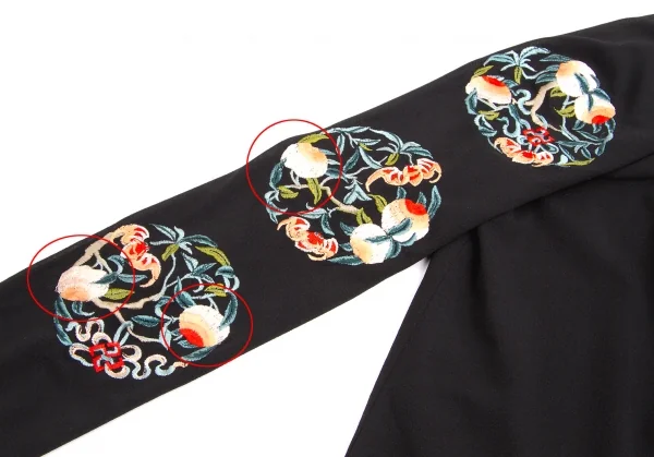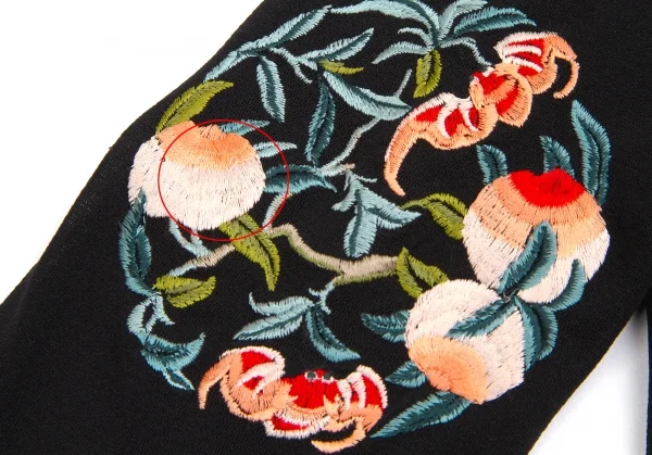 袖シミ、引っ掛けあり、刺繍部分ほつれ小あり(写真参照)。その他に目立ったシミ、汚れ、ほつれ等なくいい状態です。クリーニング済み