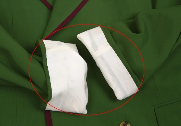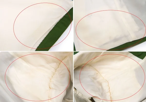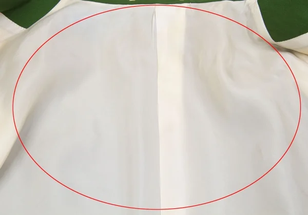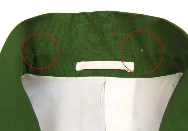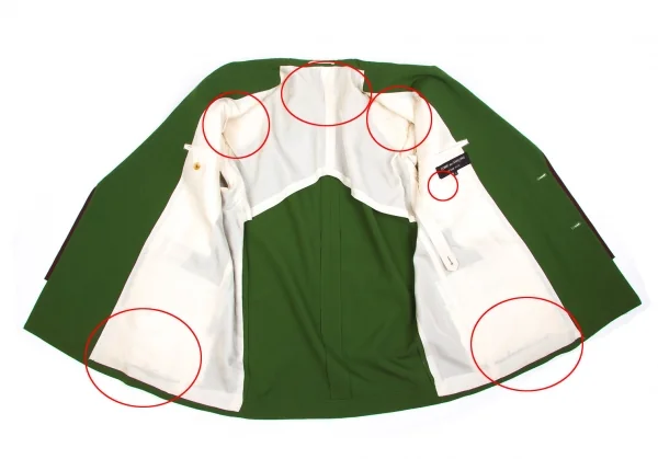 襟裏に穴あり。袖裏に薄汚れあり。裏地にループ解れ、汚れ、シミあり。(写真参照)クリーニング済み。