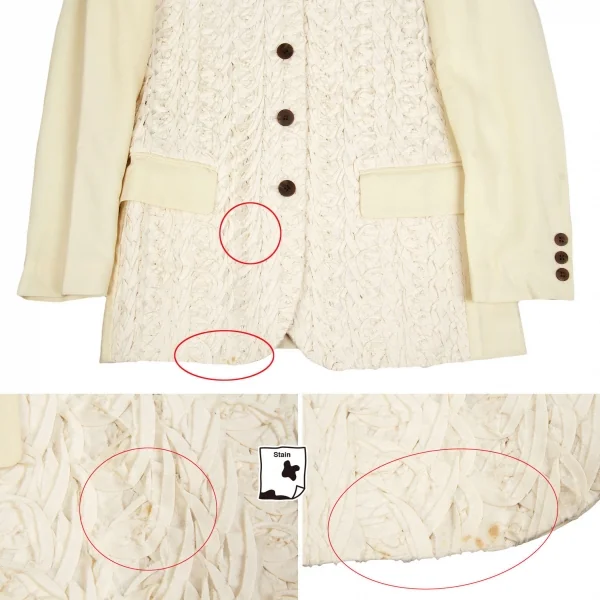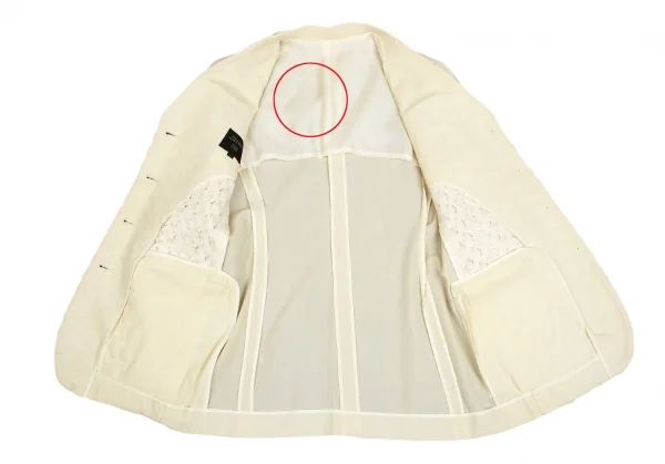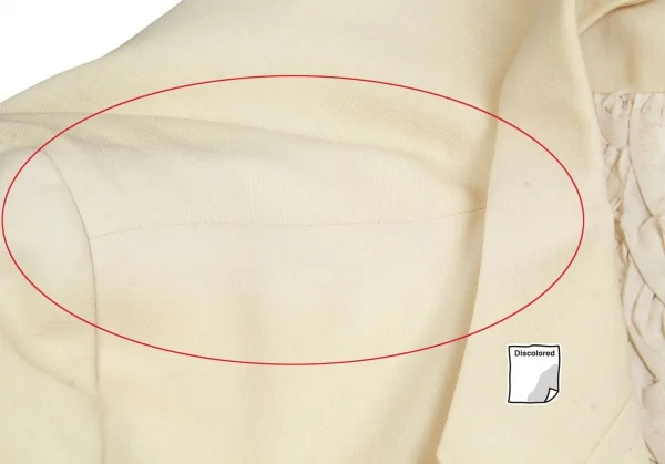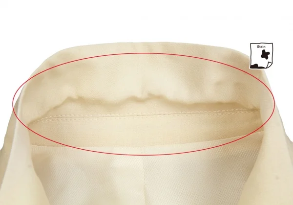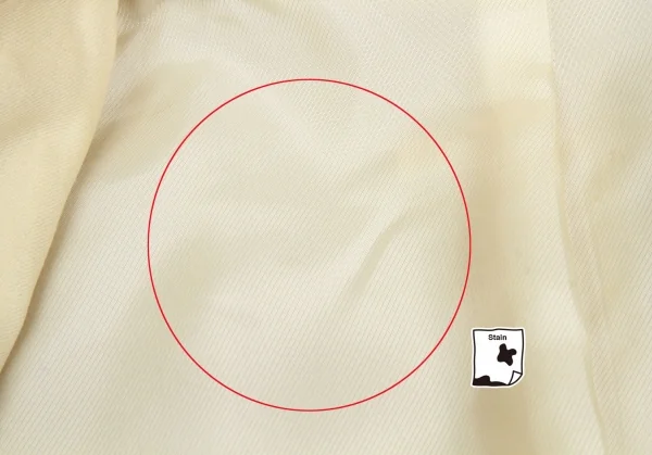 襟裏に汚れあり。肩に色褪せあり。前身頃にシミあり。裏地に薄汚れあり。(写真参照)クリーニング済み。