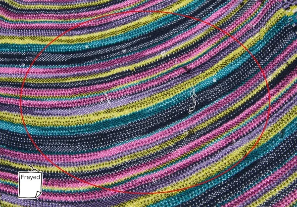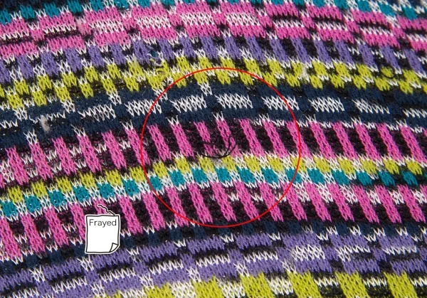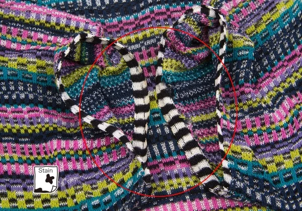 首回り、袖先にシミあります。身頃、ラップ部分裏に引っ掛け多数あります。(写真参照)その他に目立った汚れはなくいい状態です。クリーニング済み