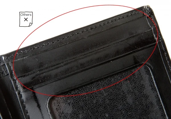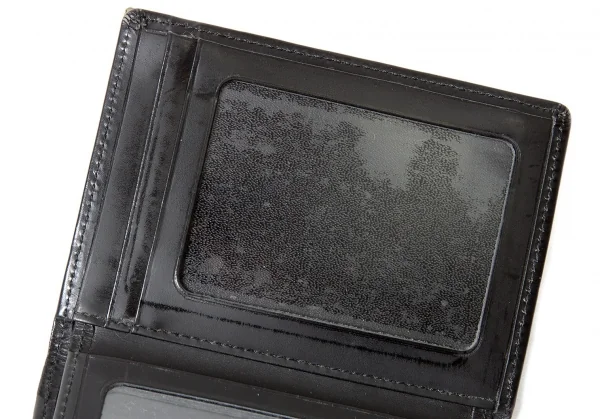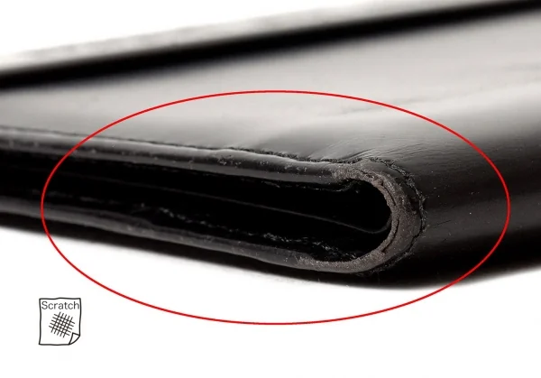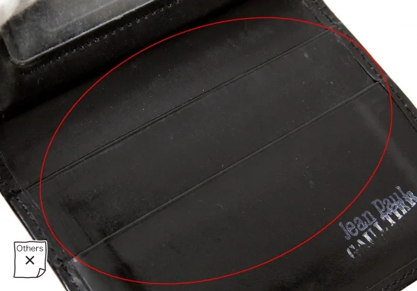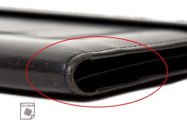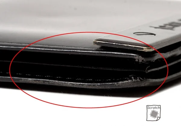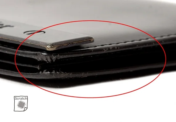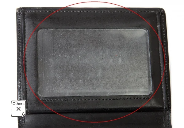 全体的にスレ・キズ多数、内側にテカリ、ロゴのスレ、カード入れの内側にベタつきがあります(画像参照)。