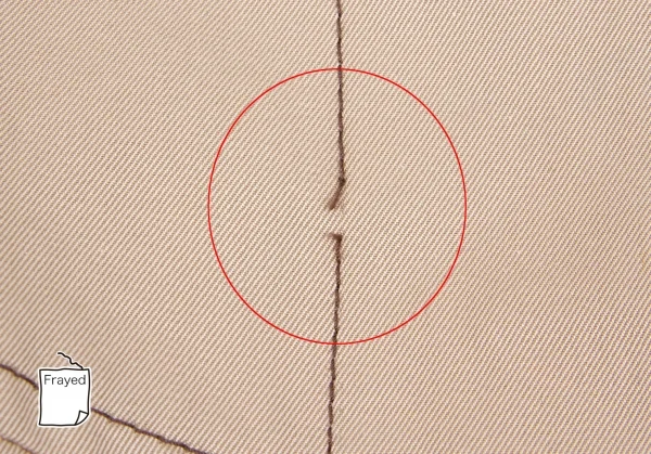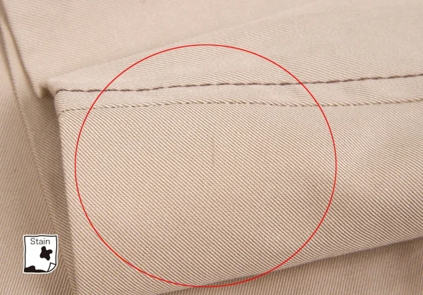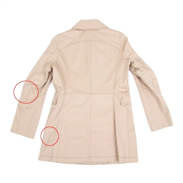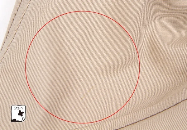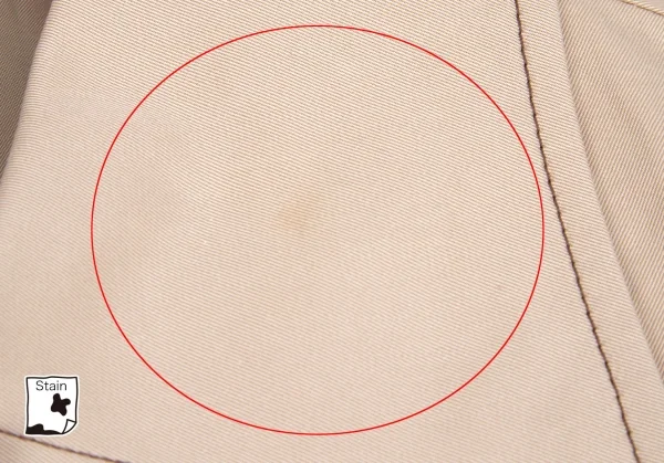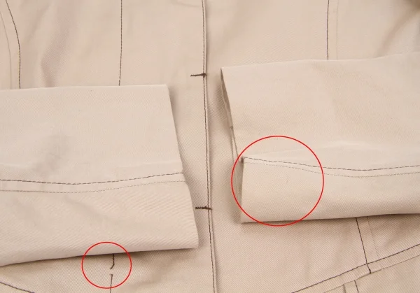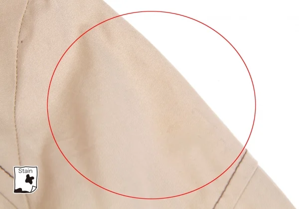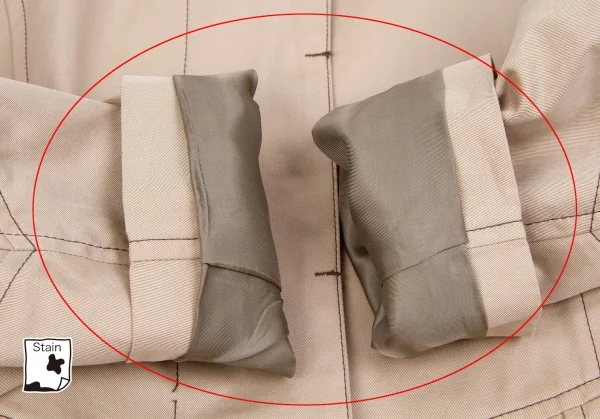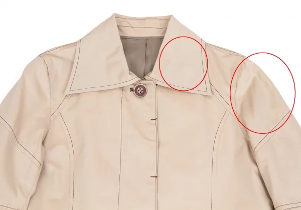 襟、左袖に薄シミあり。袖先、後身頃に薄汚れあり。前身頃にステッチ切れ箇所あります。(写真参照)その他に目立ったシミ、汚れ等なくいい状態です。クリーニング済み
