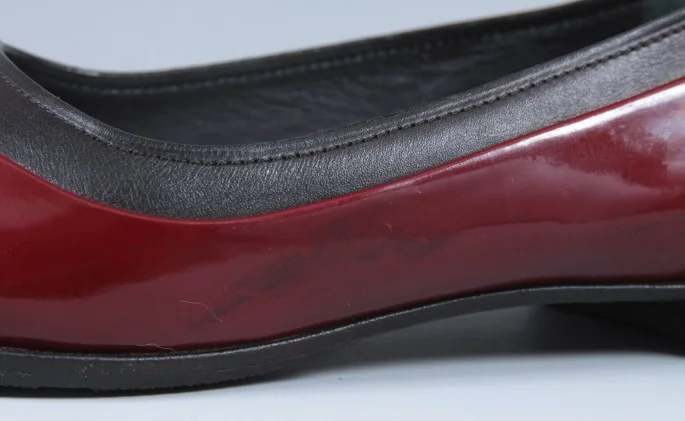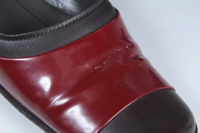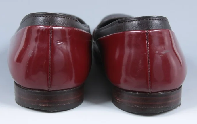 甲部分が寄れありで、左足外側に汚れありです(写真ペン先参照)。全体的にはソールの減りも少なくいい状態だと思います。