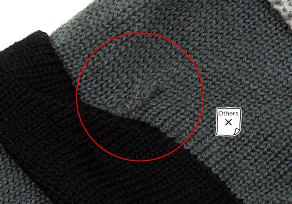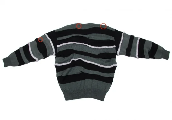 前身頃にシミ、後ろ右肩と左袖に補修跡、首元一部糸が細くなっていて穴が飽きそうになっています(写真参照)。クリーニング済み