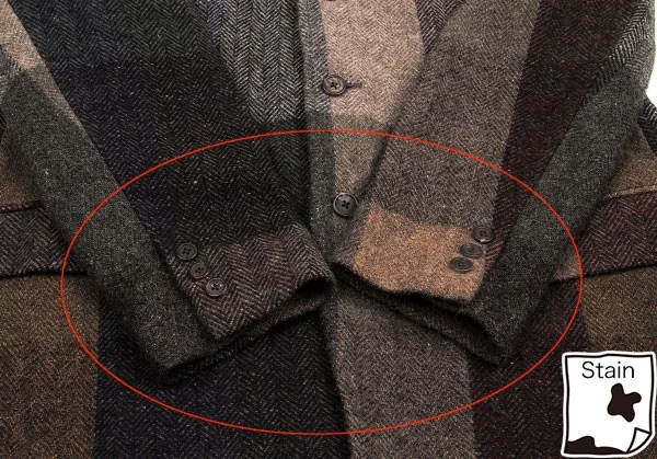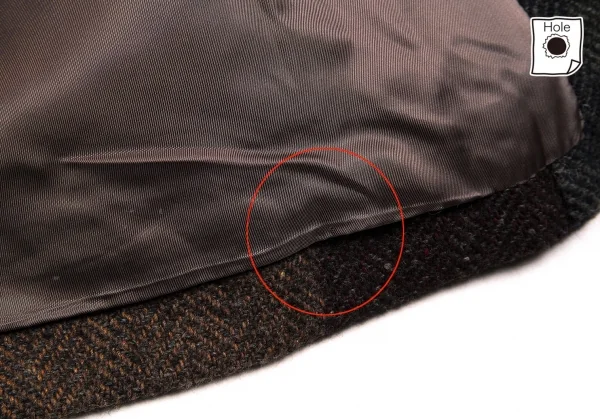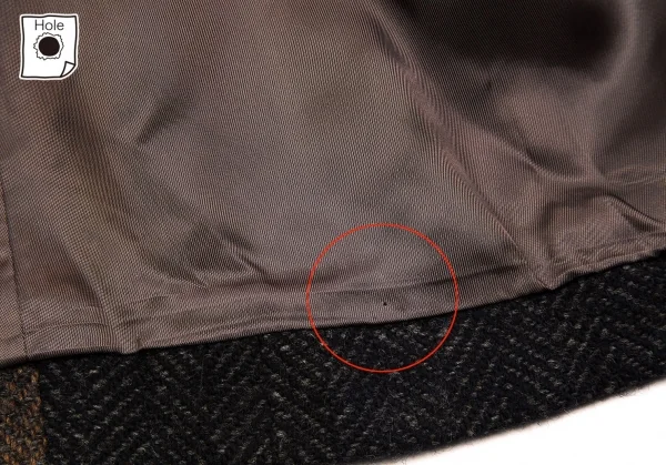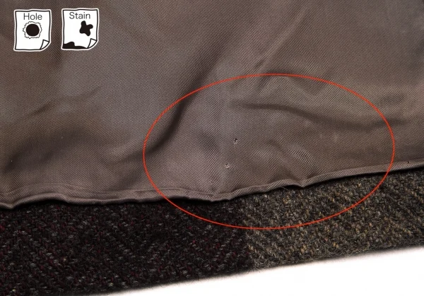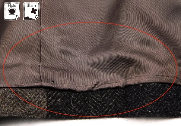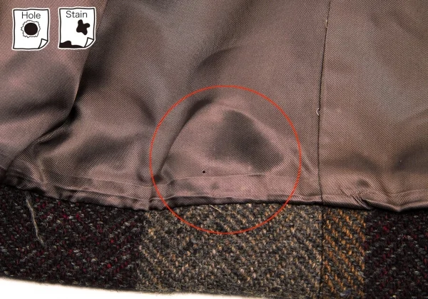 袖にシミ、裏地裾に穴、汚れがございます。(写真参照)クリーニング済み。