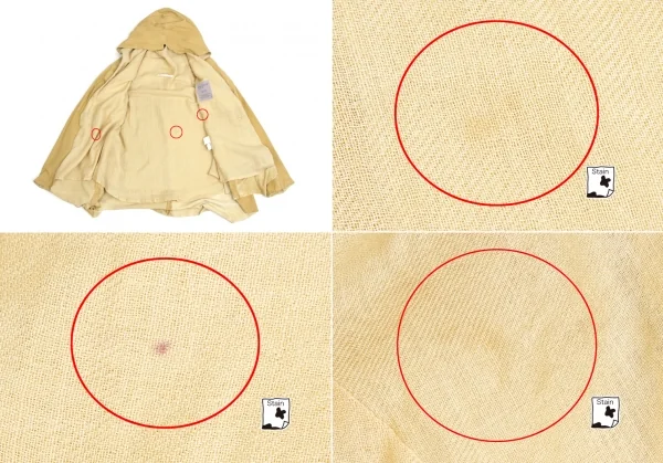 ジャケットの裏地に三箇所シミがございます(写真参照)。その他、目立った汚れ、ほつれ等なくいい状態です。クリーニング済み