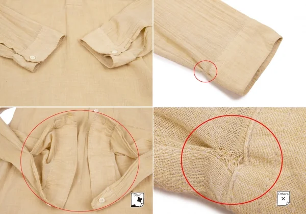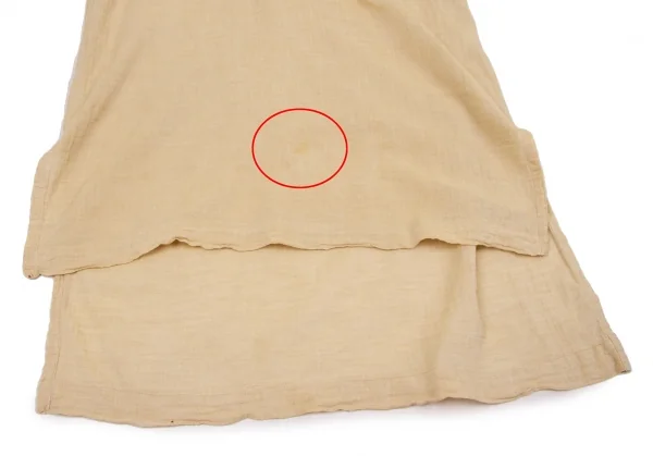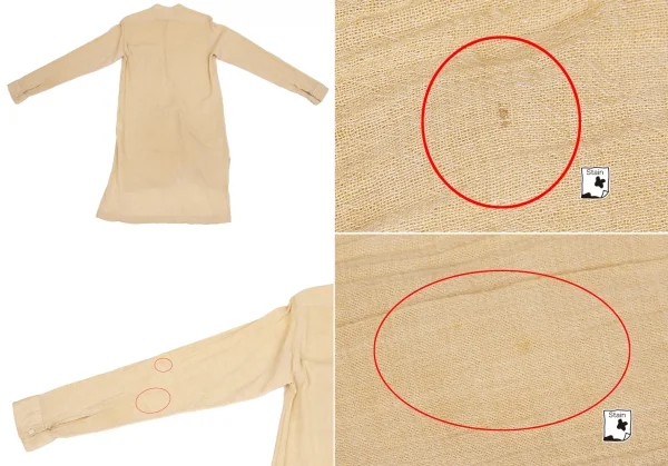 左袖先補修跡、前後身頃・左袖後ろ側にシミがございます(写真参照)。クリーニング済み