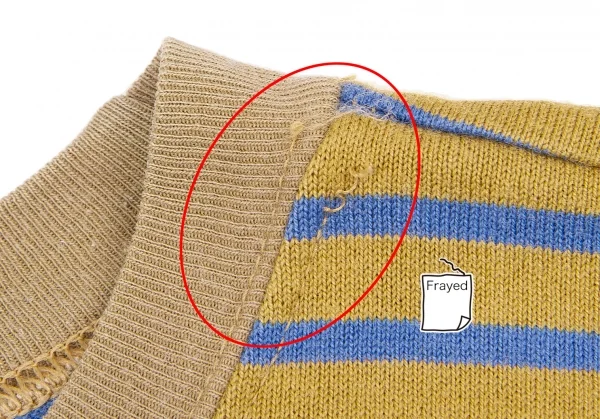 首元縫い目にほつれ、左肩後ろ側に薄シミがございます(写真参照)。その他、目立ったシミ、汚れ、ほつれ等ございません。クリーニング済み