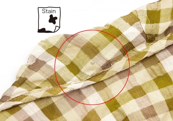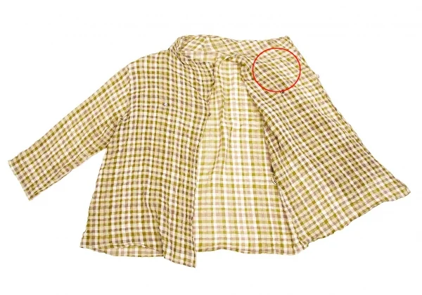 前身頃合わせ裏、後ろ首元にシミがあります。品質タグにネーム書き込みがあります(写真参照)。クリーニング済み