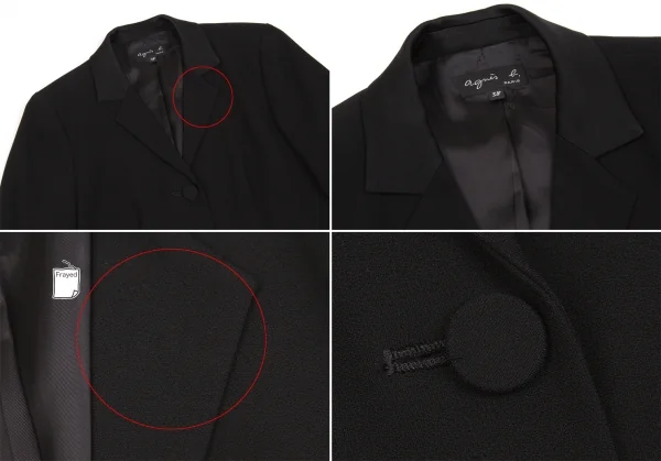 ジャケット:襟元に薄汚れがあります。パンツ:全体的に若干の着用感、ウエスト裏に小穴、後ろウエストに汚れがあります(画像参照)。クリーニング済み