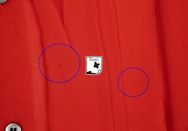 品質表示タグなし、前フリルに薄い点シミがあります(画像参照)。その他目立ったシミ、汚れ、ほつれ等なくいい状態です。クリーニング済み