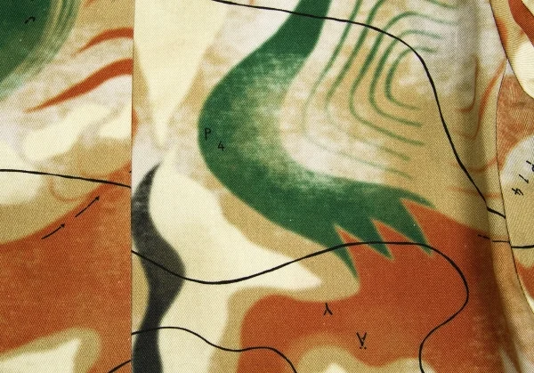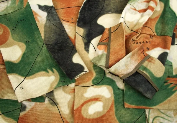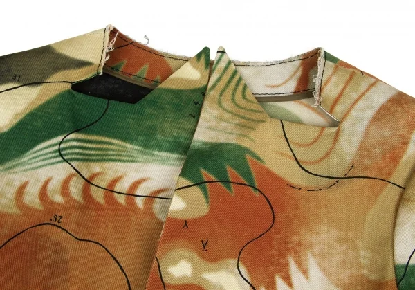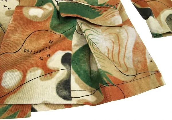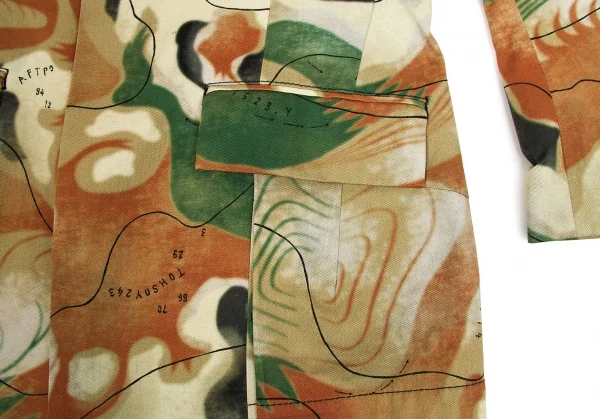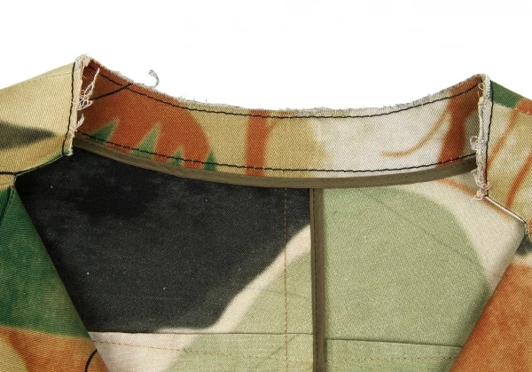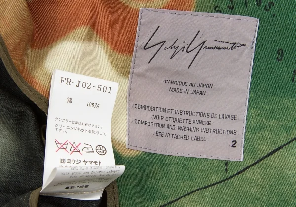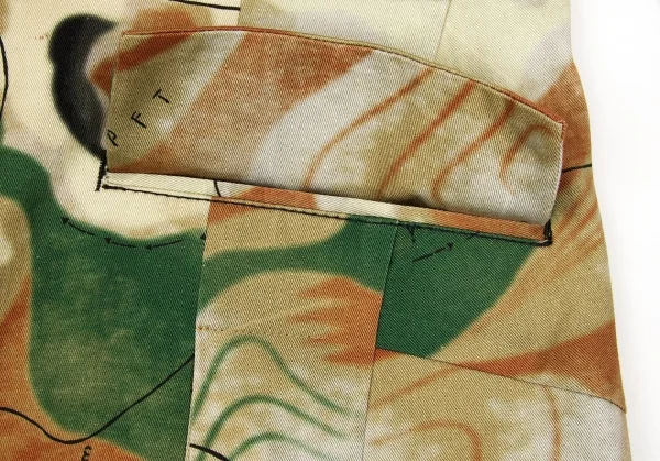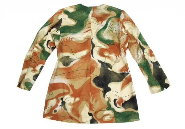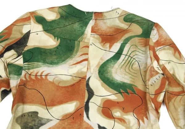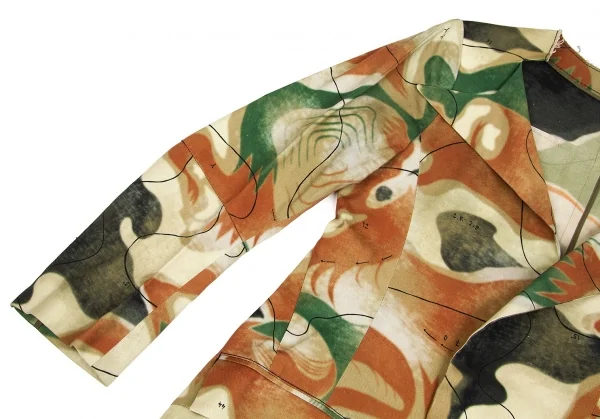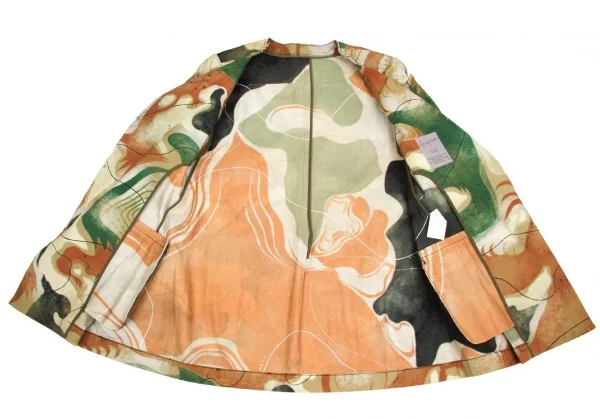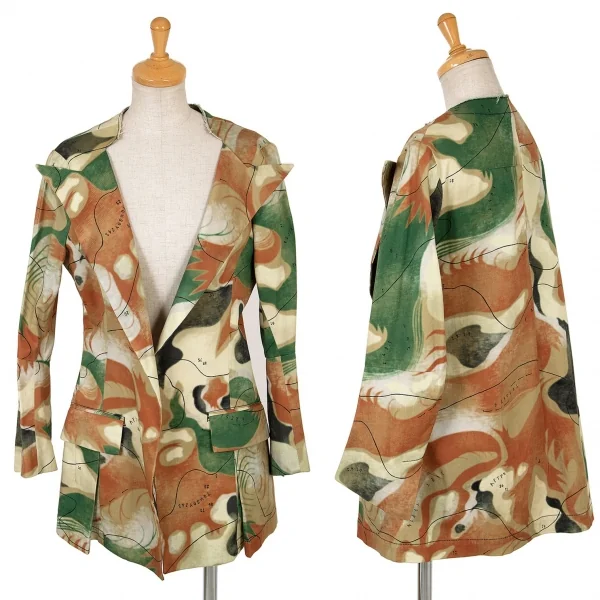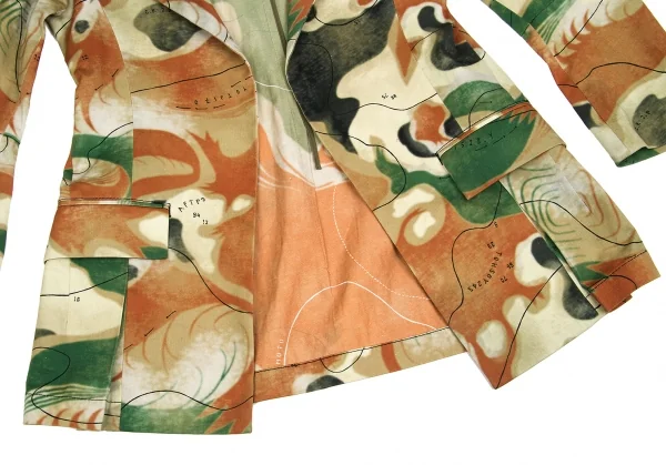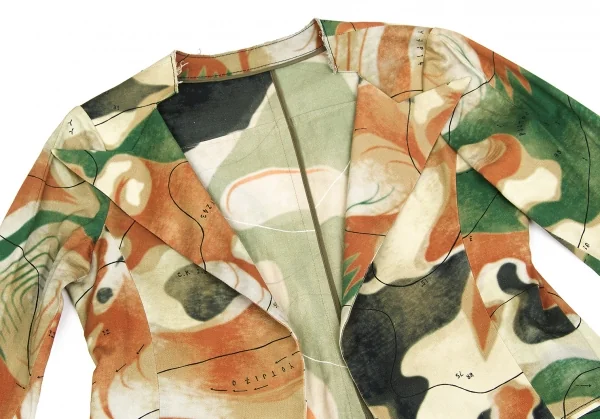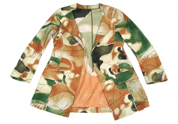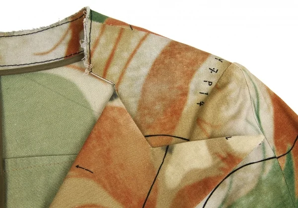 【SALE】ヨウジヤマモト ファムYohji Yamamoto FEMME コットングラフィックプリントカットオフピークドラペルボタンレスジャケット 濃淡緑マルチ2