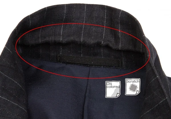 品質表示タグなし、全体的に毛羽立ち・着用感あり、ジャケット襟裏にスレ・色あせがあります(画像参照)。クリーニング済み
