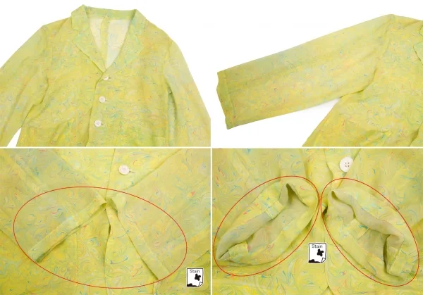 ジャケット:袖先・袖裏に薄汚れがあります。 スカート:裾裏のロックにほつれ、裾裏・後ろ裾全体に汚れがあります(画像参照)。その他目立ったシミ、汚れ、ほつれ等なくいい状態です。クリーニング済み