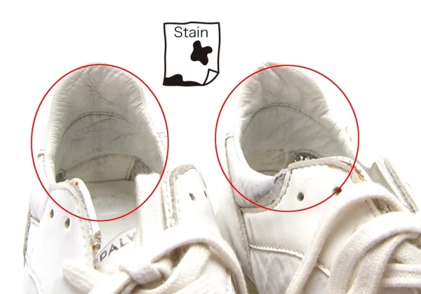 所々接着汚れ、履き口にダメージがあります(写真参照)。全体的に使用感はありますが、まだまだお使いいただけるお品です。