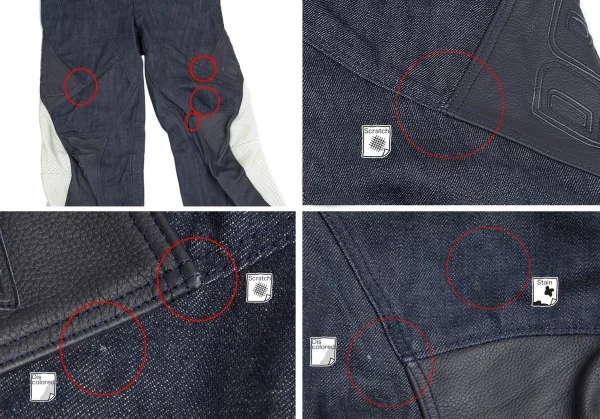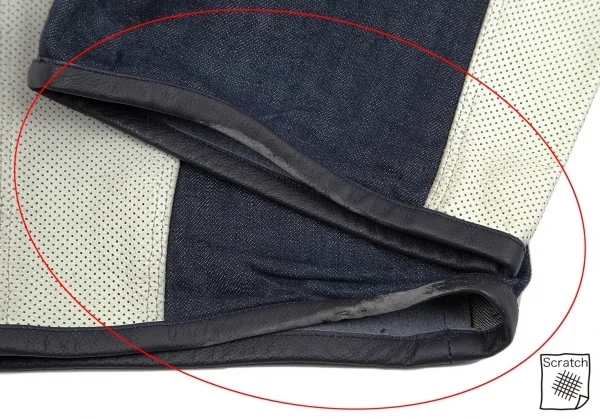留め具が欠品しています。前レザー・裾裏・後ウエストにスレ、前裾にスレ・色褪せ、後裾にスレ・破れがあります(画像参照)。その他に目立ったシミ、汚れ、ほつれ等ありません。クリーニング済み