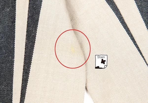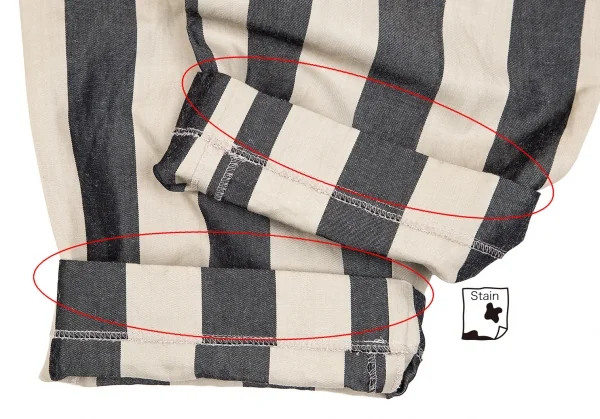 左太ももに汚れ、右脚内側にシミ、裾裏に薄汚れがあります(画像参照)。その他目立ったシミ、汚れ、ほつれ等ありません。クリーニング済み