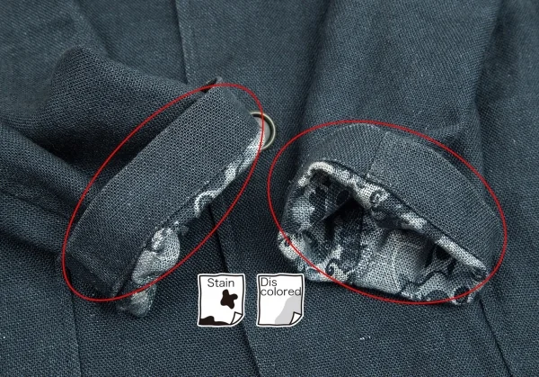 生地の白い部分は元々のデザインです。襟裏・袖裏に薄汚れがあります(画像参照)。その他に目立ったシミ、汚れ、ほつれ等ありません。クリーニング済み