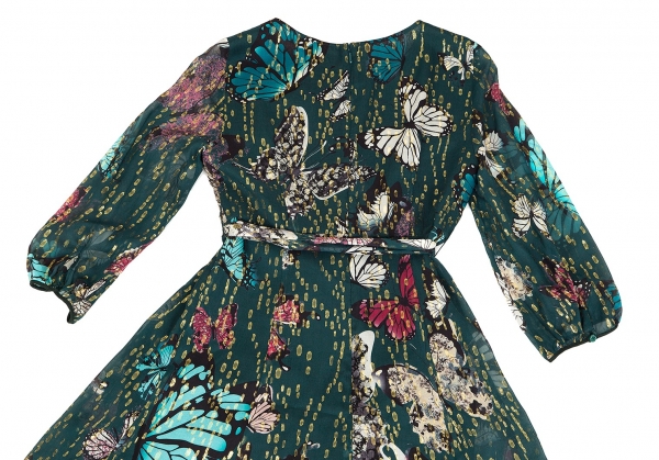 マックスアンドコーMAX&Co バタフライプリント袖シースルーワンピース 緑ラメ36