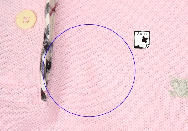 前身頃に薄シミ、品質表示タグにネームの書き込みがあります(写真参照)。その他に目立ったシミ、汚れ、ほつれ等ありません。クリーニング済み