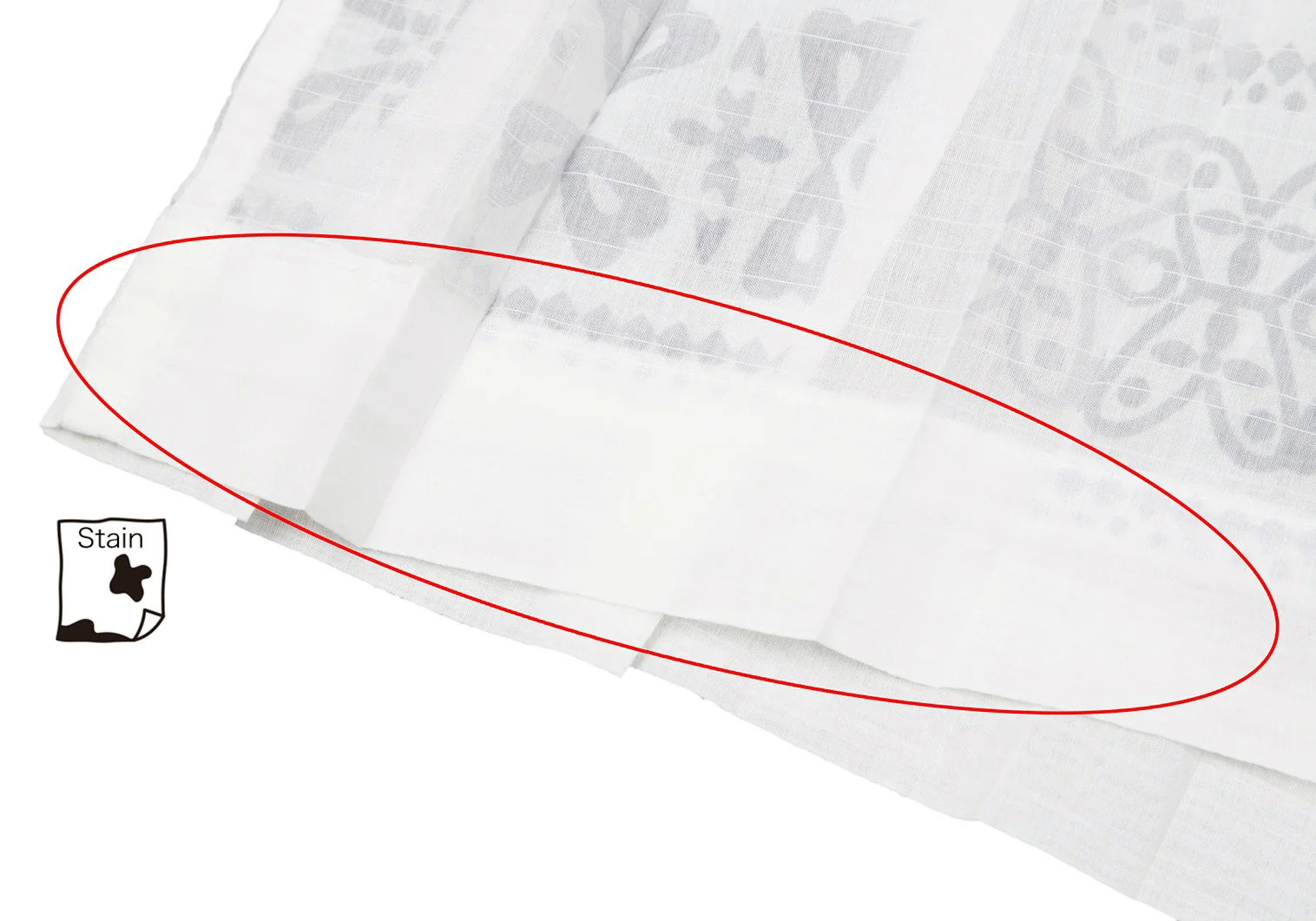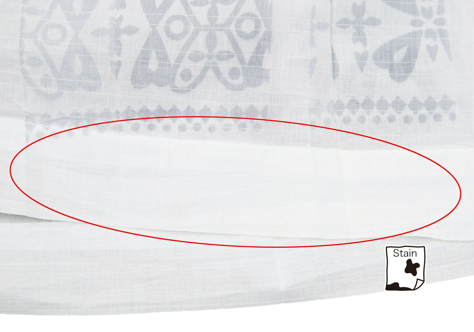 透け感のある生地です。後ろ裾に薄シミがあります(画像参照)。その他目立ったシミ、汚れ、ほつれ等ありません。クリーニング済み