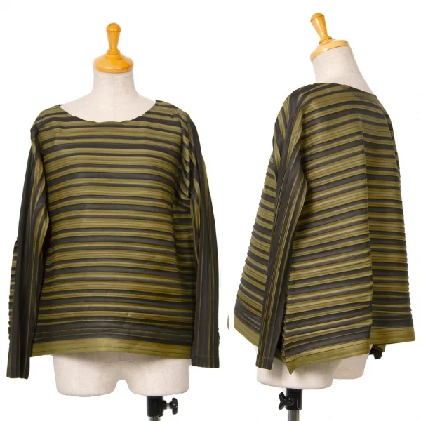 プリーツプリーズPLEATS PLEASE バイカラーボーダードルマンカットソー カーキ黒3