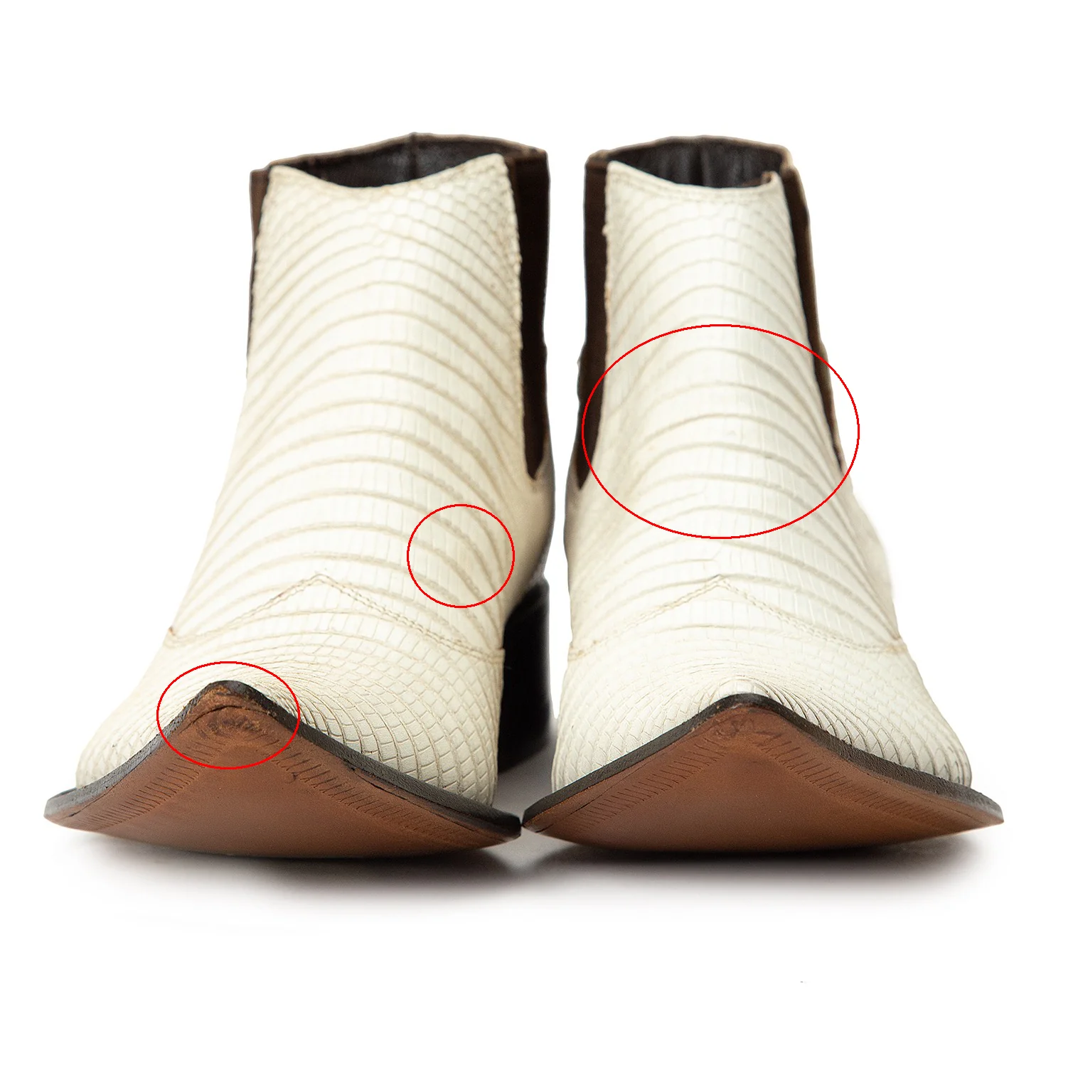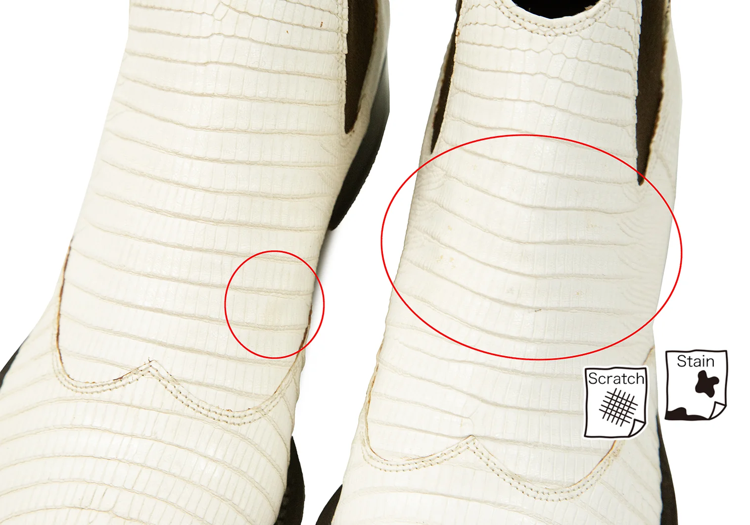 右足つま先ソールの繋ぎ目に割れ、甲部分にスレ・薄汚れがあります(画像参照)。その他ソールの減りも少なく、目立った傷や汚れなどなく使用感の少ないお品です。