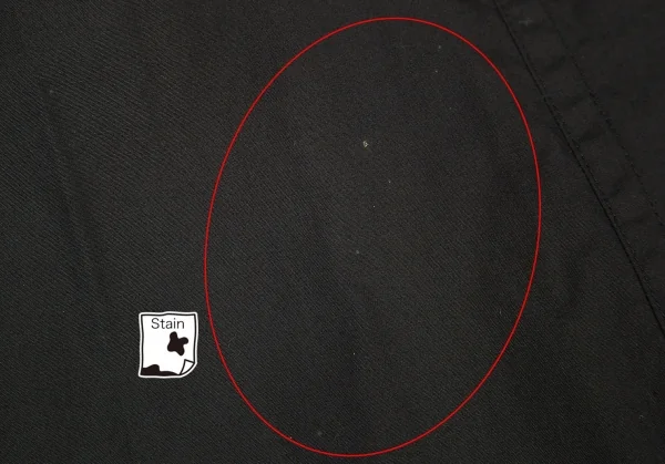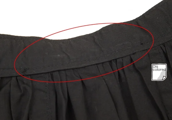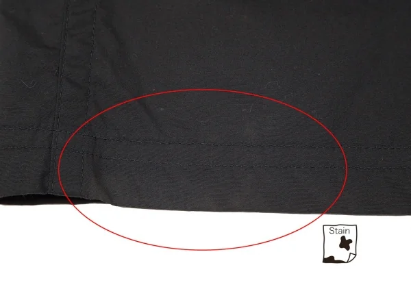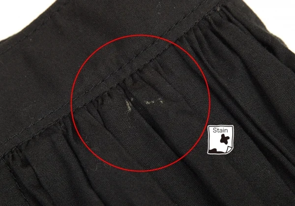 前中間・裾・後ろウエストに汚れ、ウエスト裏に色褪せがあります(画像参照)。その他目立ったシミ、ほつれはありません。クリーニング済み