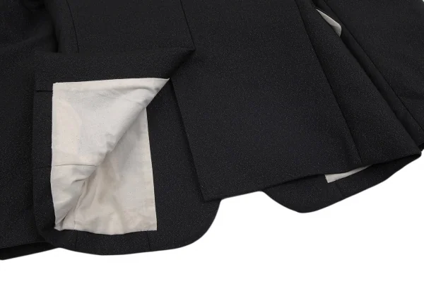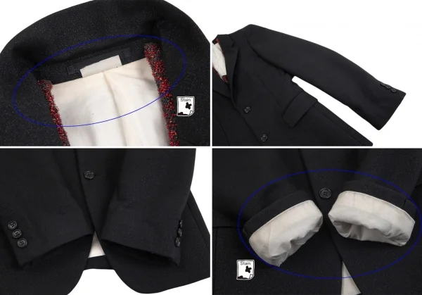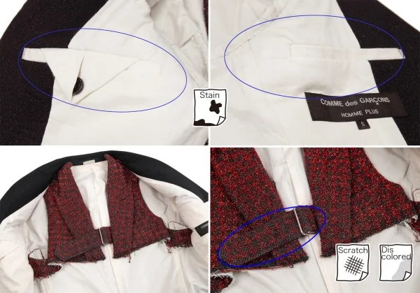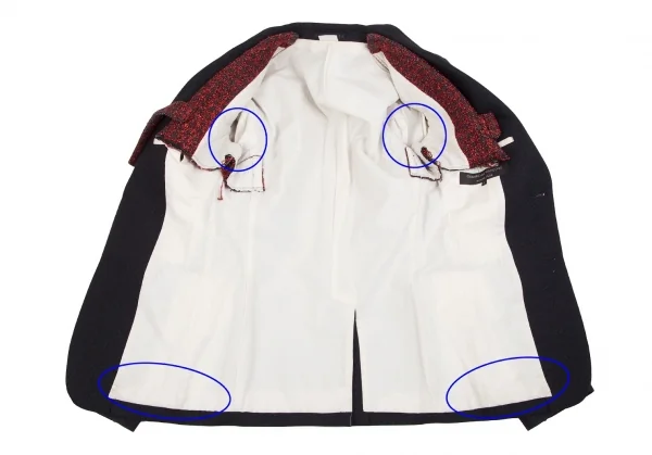 2017A/Wコレクション着用アイテムです。ラメ糸が使用されています。ハーネスはジャケットから着脱できません。襟裏・袖裏・裏地脇下・裏地裾に汚れ、裏地ポケット付近に薄く色移り、ハーネスのベルトにスレ・色褪せがあります(画像参照)。クリーニング済み
