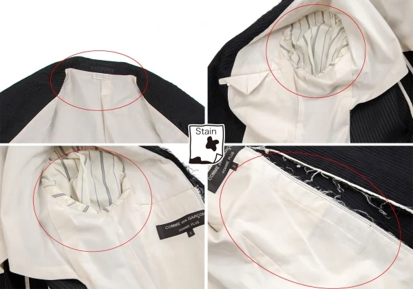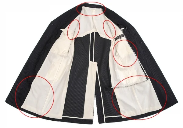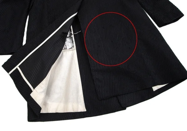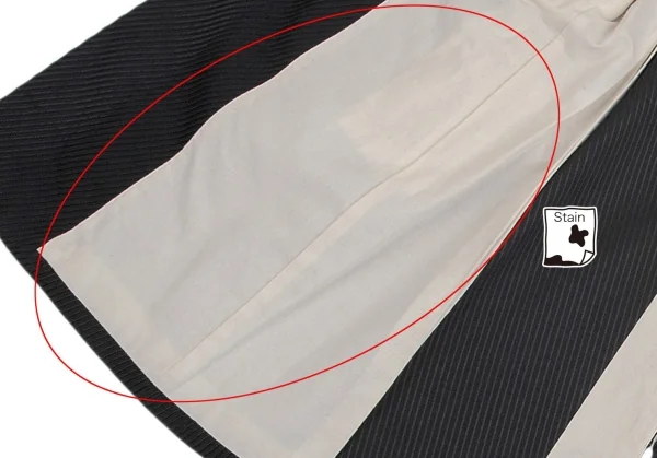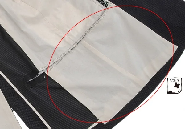 裏地全体に薄汚れが多数あり、後裾にダメージがあります(画像参照)。その他に目立ったシミ、汚れ、ほつれ等ありません。クリーニング済み