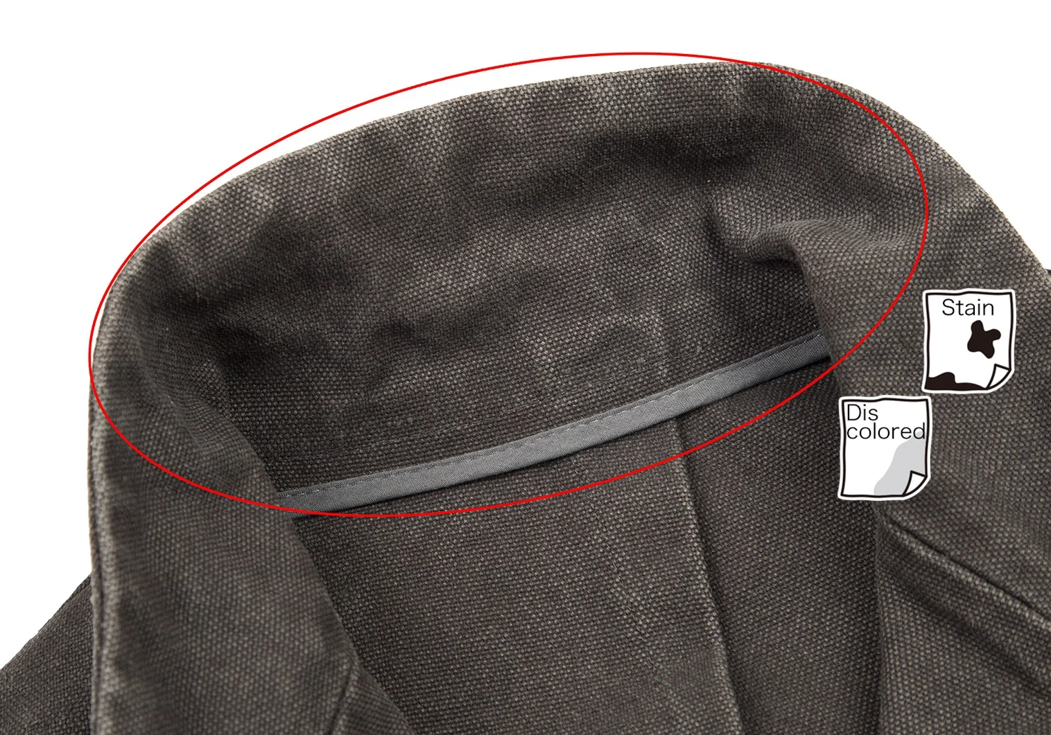 襟裏に色褪せ・薄汚れ、袖裏に色褪せがあります(画像参照)。その他に目立ったシミ、汚れ、ほつれ等ありません。クリーニング済み