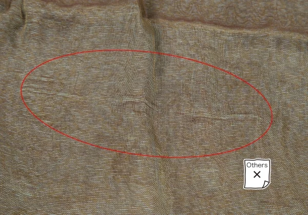 透け感のある生地です。品質表示タグがありません。画像のような生地のヨレが所々にあります(画像参照)。その他目立ったシミ、汚れ、ほつれ等なくいい状態です。クリーニング済み