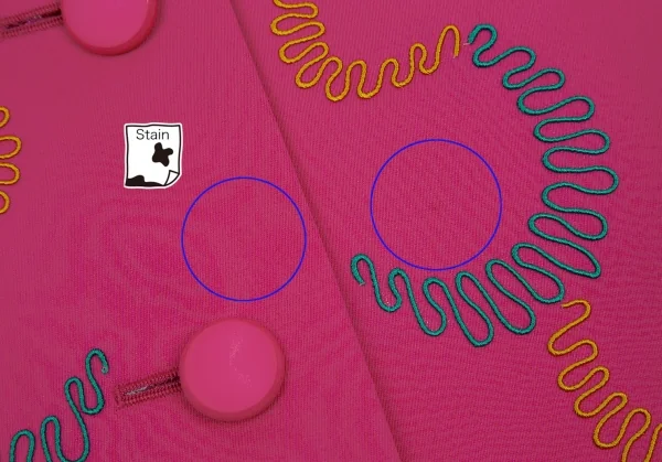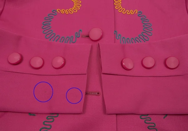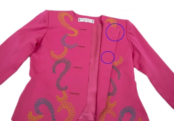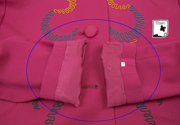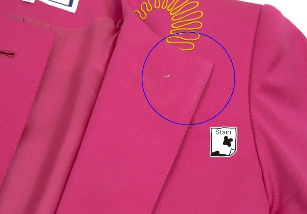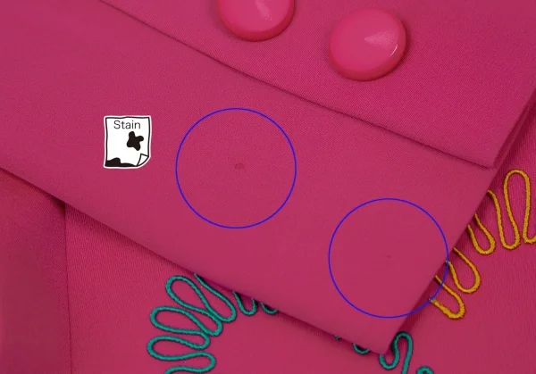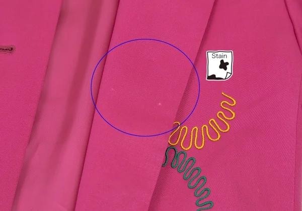 内側に肩パッドあり。前身頃・右袖にシミ、身頃裏・袖裏に薄汚れがあります(画像参照)。その他に目立ったシミ、汚れ、ほつれ等ありません。クリーニング済み