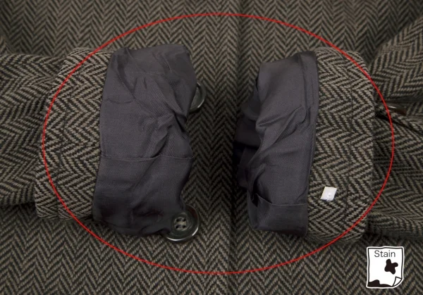 厚めの肩パッドが入っています。袖裏に変色があります(画像参照)。その他目立ったシミ、汚れ、ほつれ等なくいい状態です。クリーニング済み