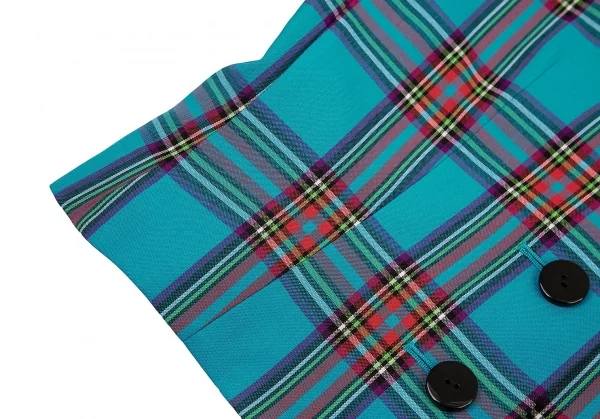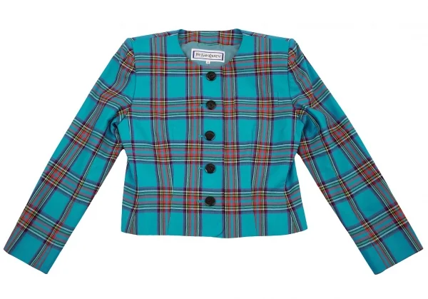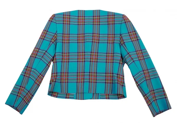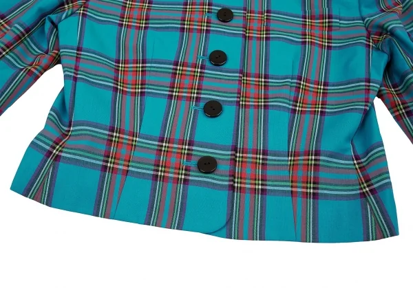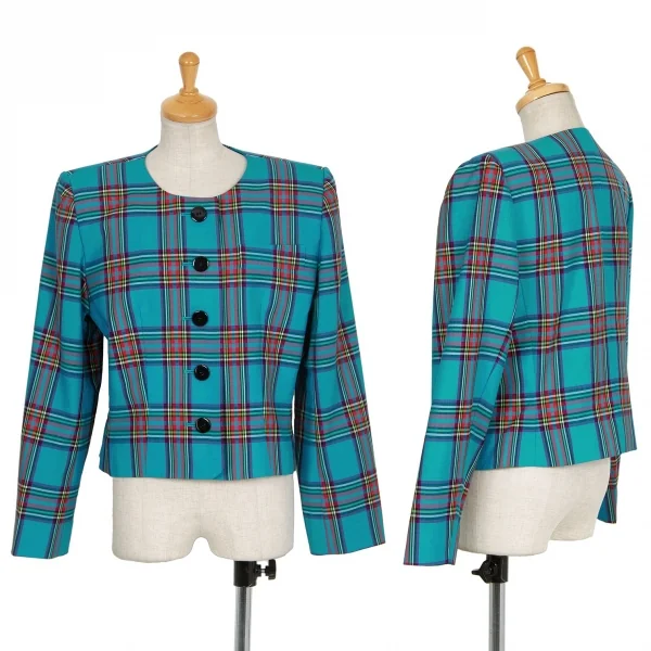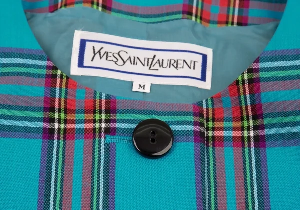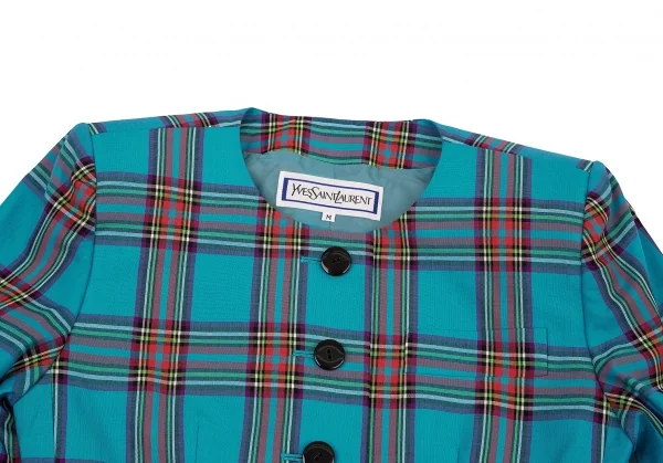 イヴサンローランYves Saint Laurent ノーカラーチェックウールジャケット 青 ターコイズM