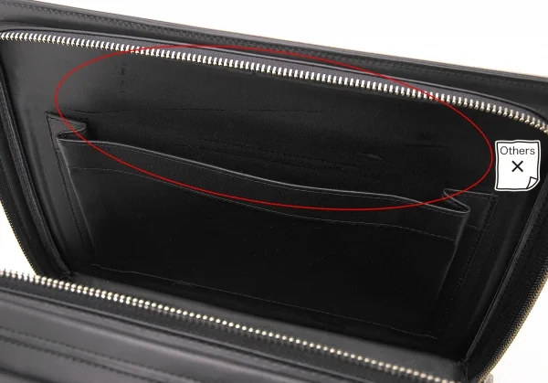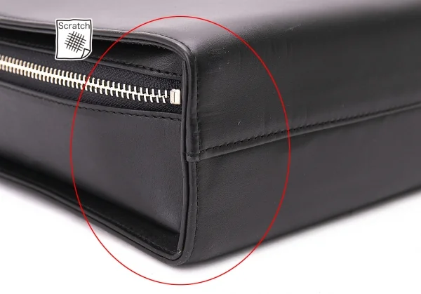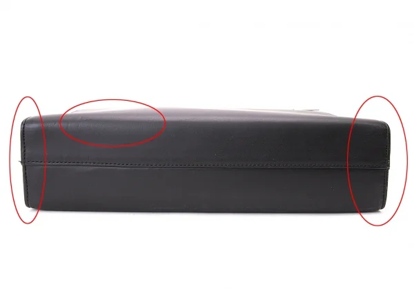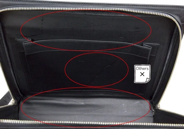 背面ポケット1、内側ポケット2つあります。全体に軽微なキズ、角スレ(小)、背面ポケットと内側にベトつきがあります(写真参照)。その他に目立った汚れ、ダメージ等なくいい状態です。