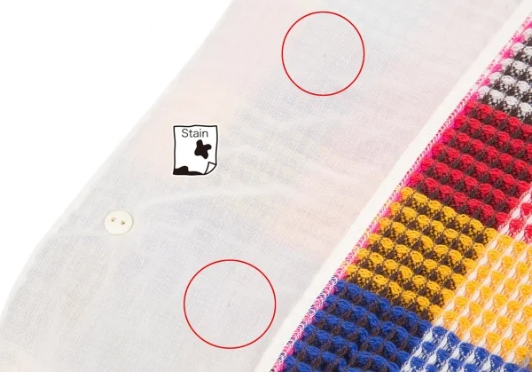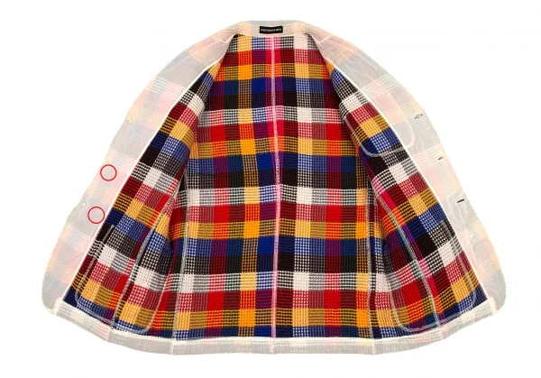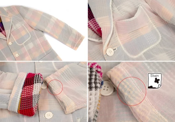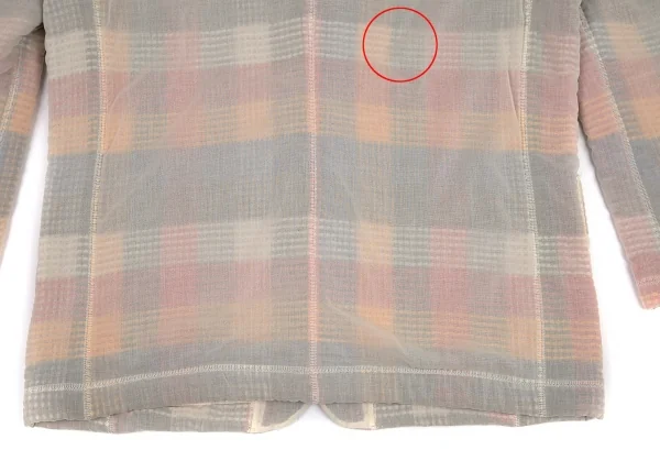 2001S/S コレクション着用アイテムです。左袖先・開き裏側・背中に点シミ、前左ポケット縁にほつれがあります(画像参照)。その他目立ったシミ、汚れ、ほつれ等ありません。クリーニング済み