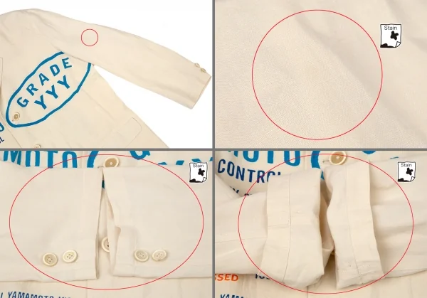 肩パッドあり。前プリント部分に少し色移り、左袖・袖先・袖裏に薄シミ、前・後ろに薄汚れがあります(写真参照)。その他に目立ったシミ、汚れ、ほつれ等なくいい状態です。クリーニング済み