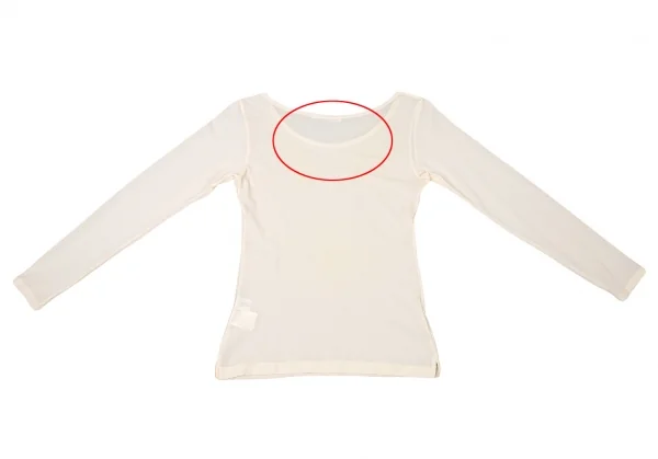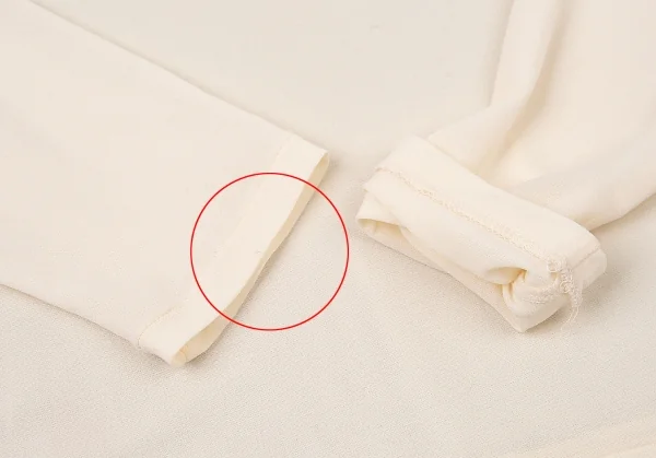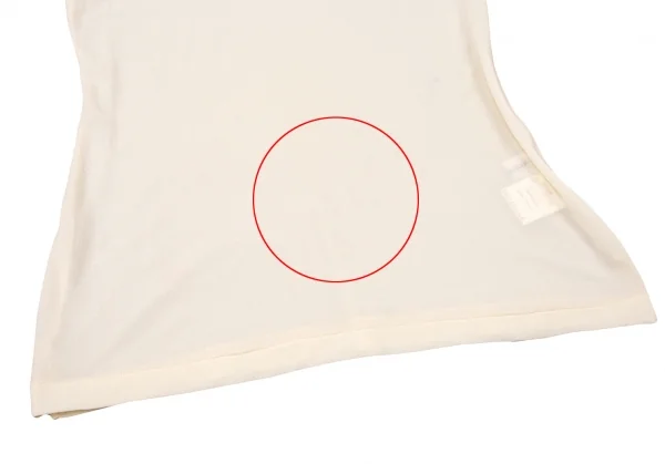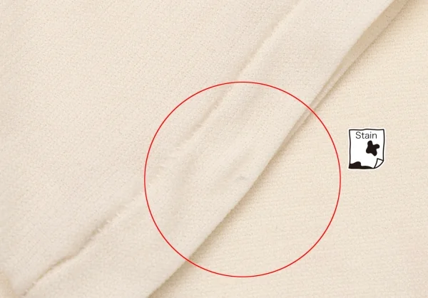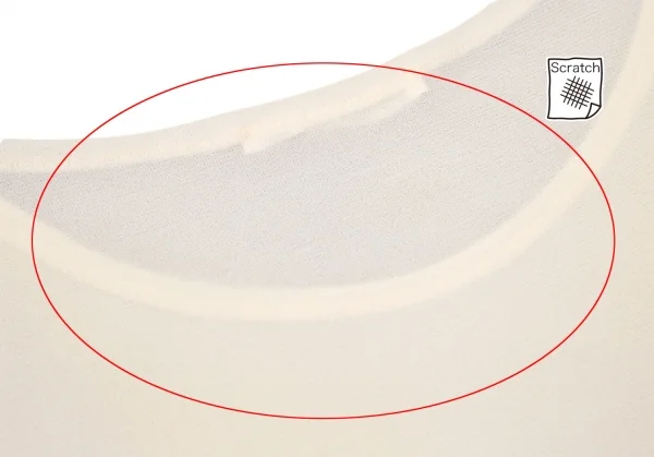 透け感のある生地です。全体に引っ掛け、右袖先に薄汚れ、前に色移りがあります(写真参照)。その他に目立ったシミ、汚れ、ほつれ等ありません。クリーニング済み