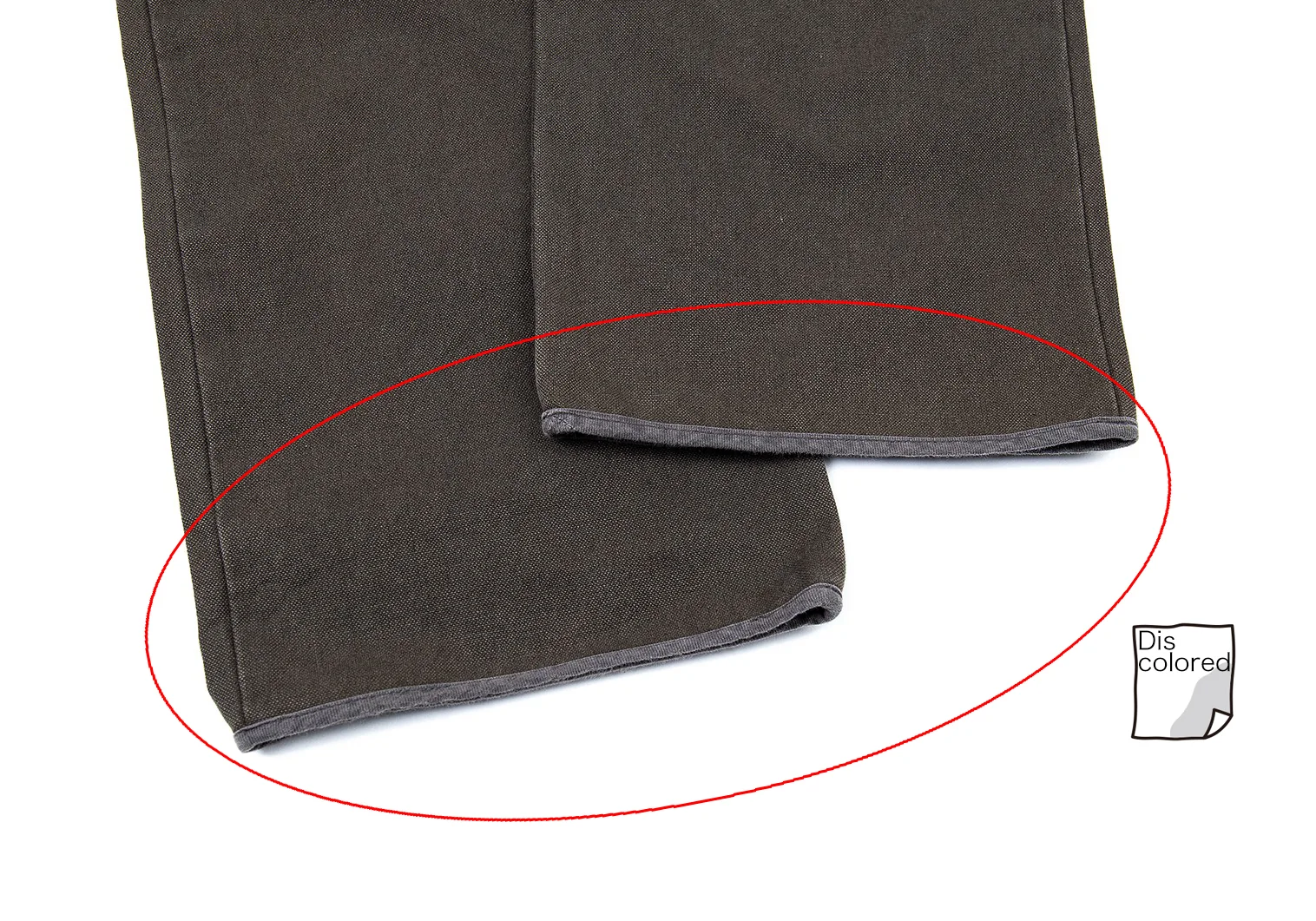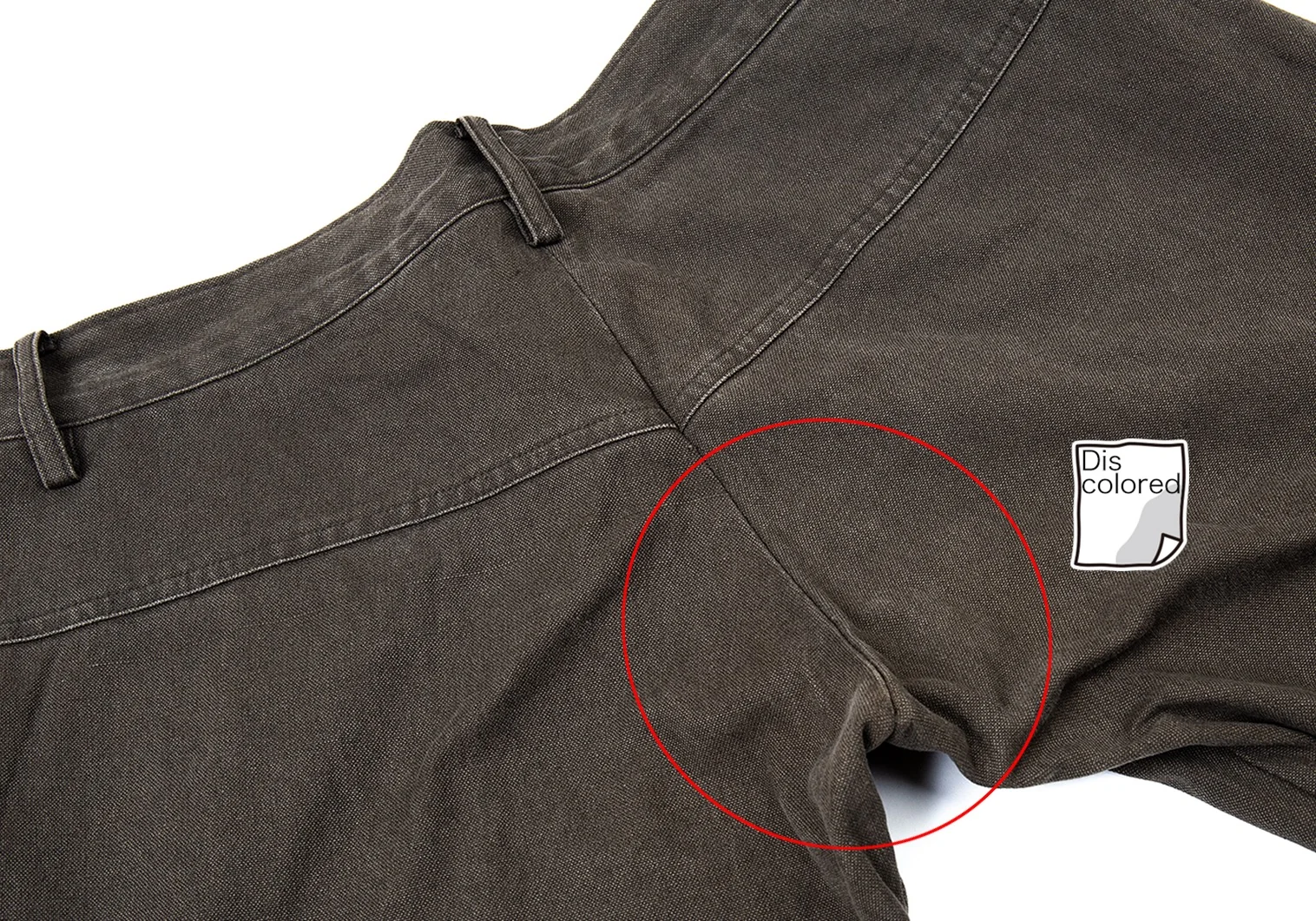 元々色褪せのあるデザインです。裾先・裾裏に色褪せ、ヒップ・股下・後ろ両足に変色があります(画像参照)。その他目立ったシミ、汚れ、ほつれ等ありません。クリーニング済み