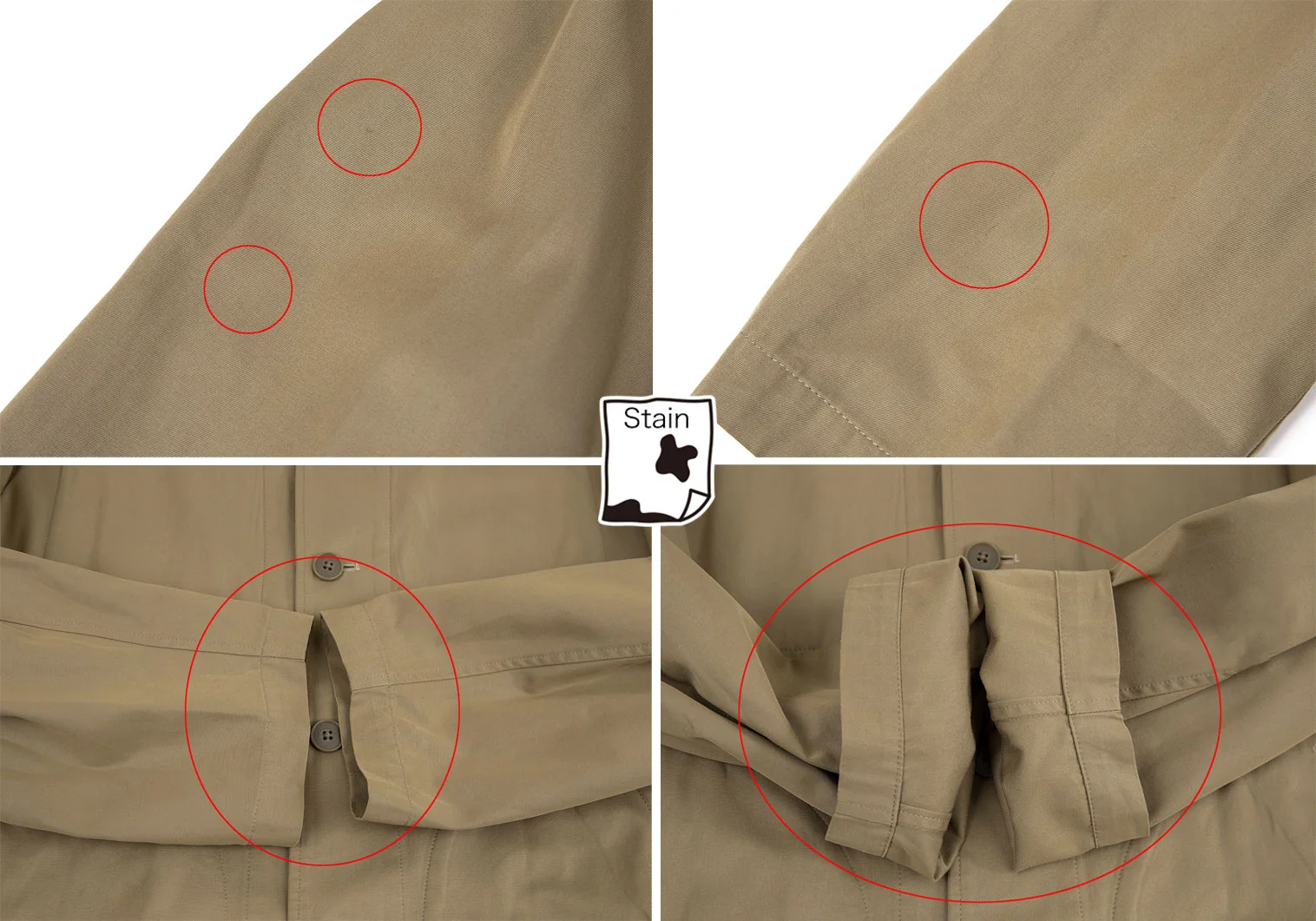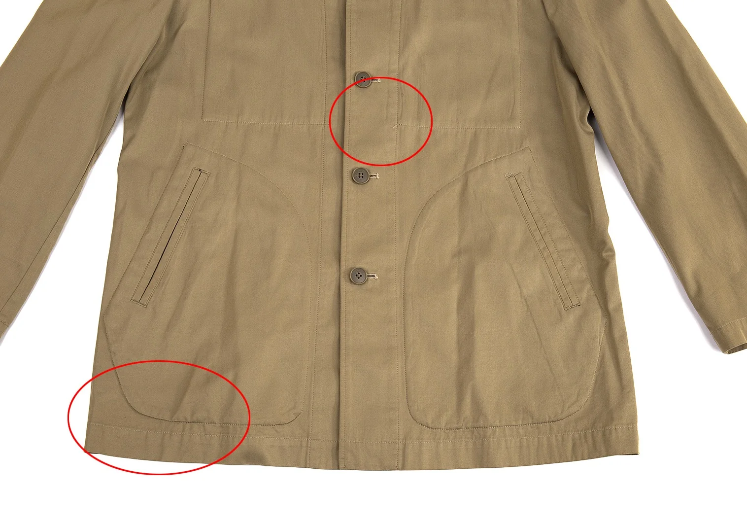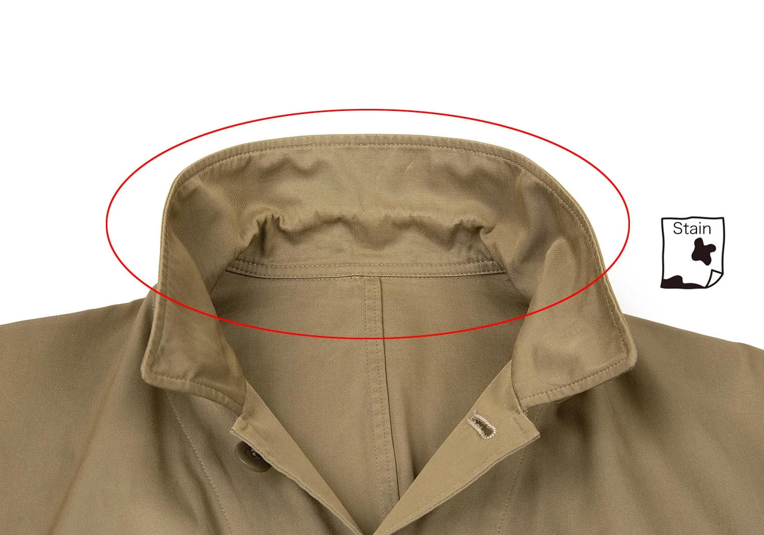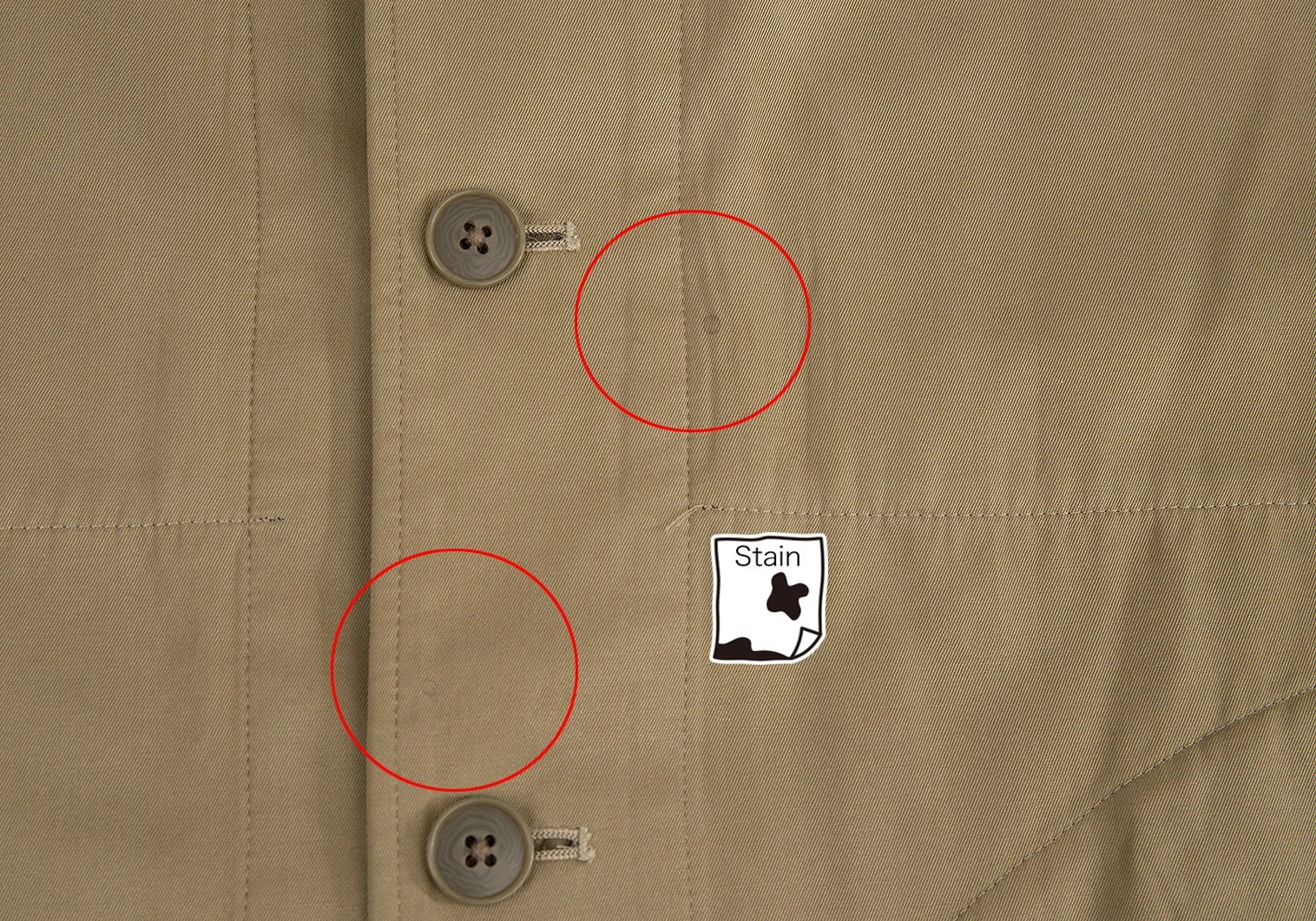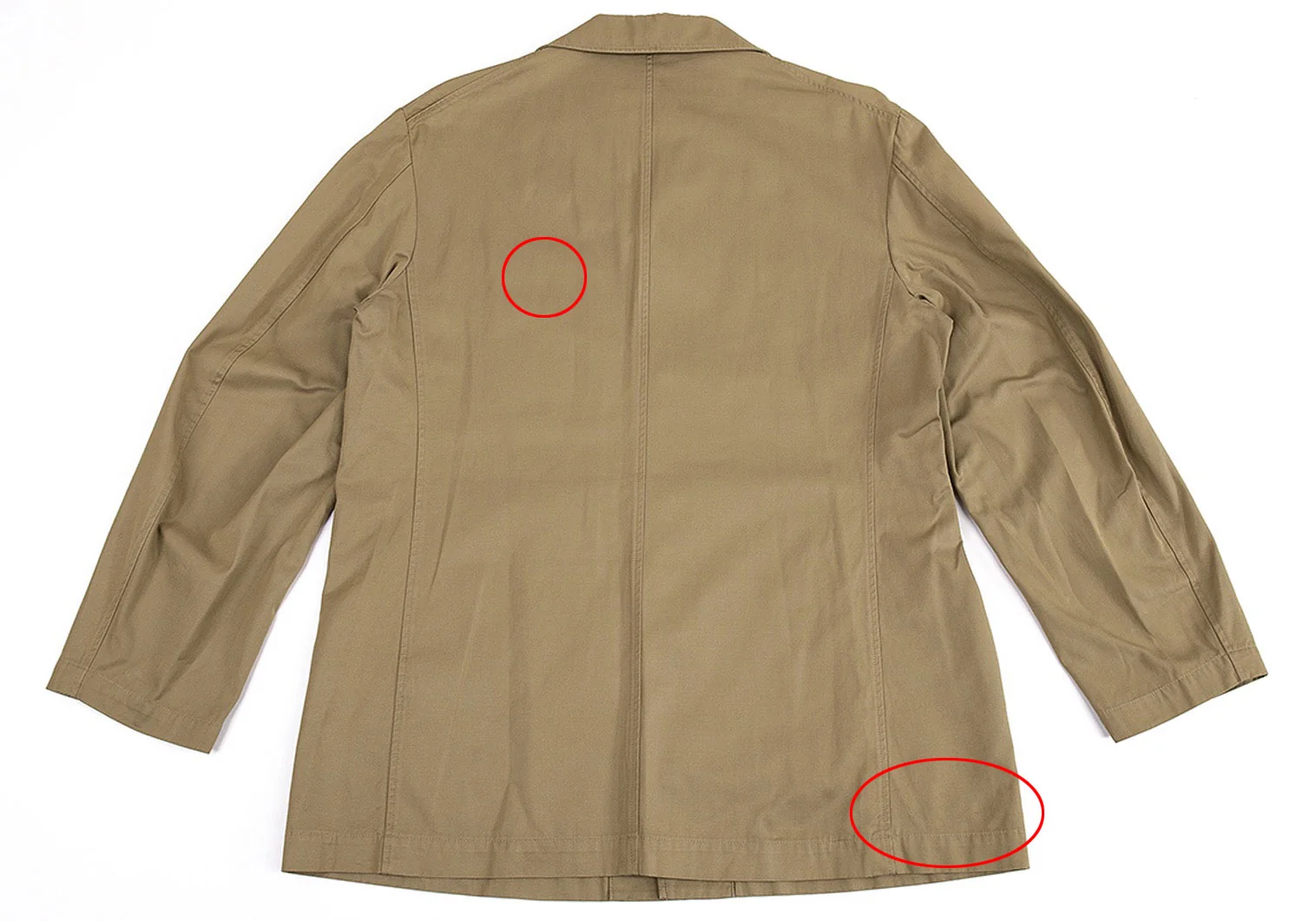 全体的に薄汚れあり、右袖にシミ・ペン汚れ、前立て裏に薄シミ、前身頃にシミ、背中・前後裾に薄汚れがあります。クリーニング済み