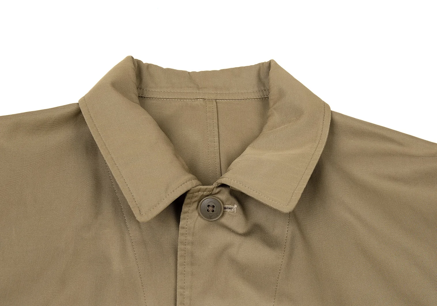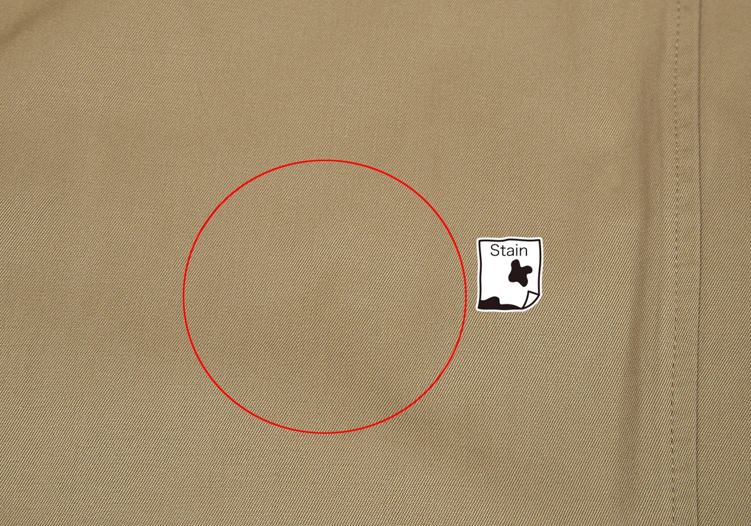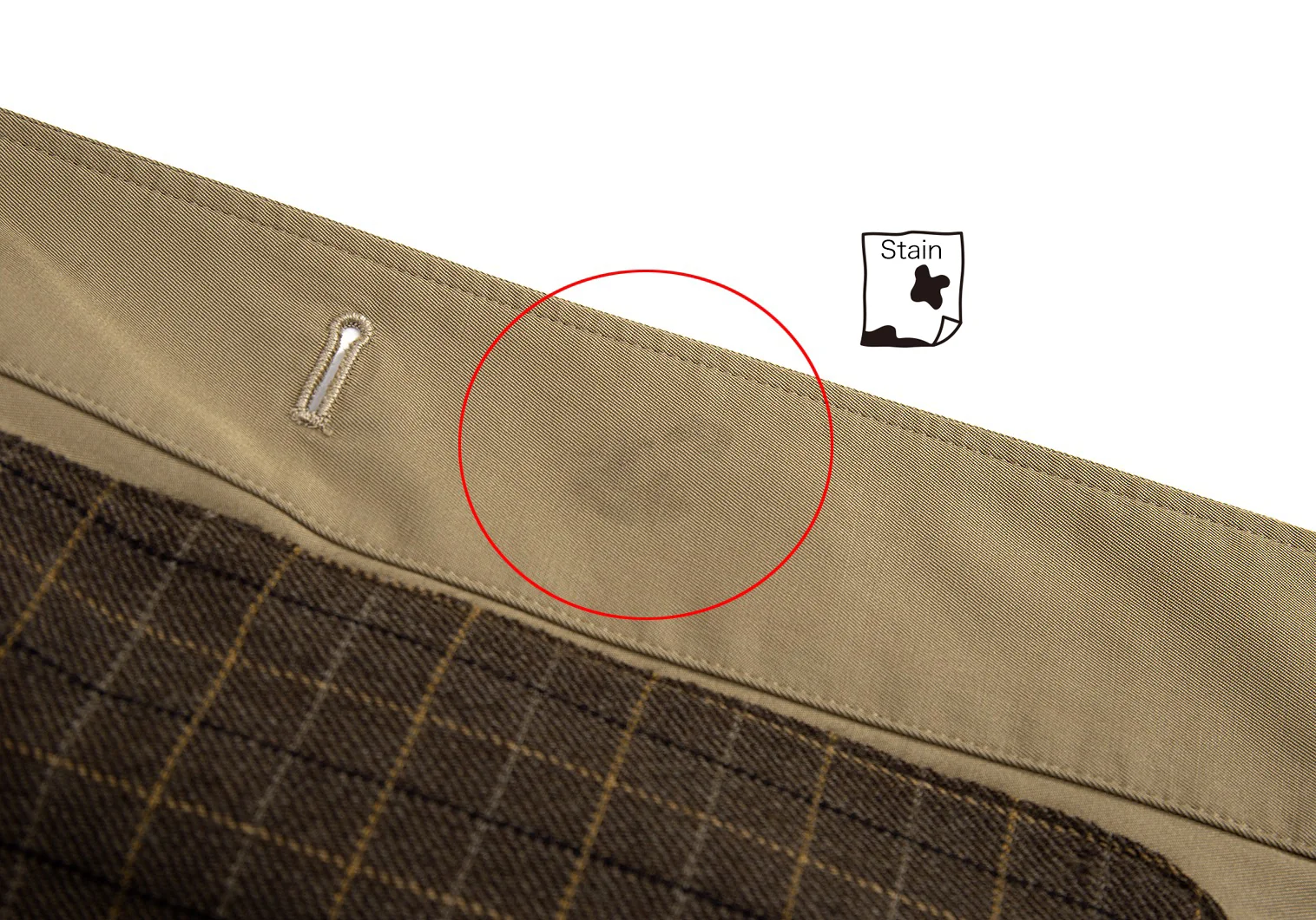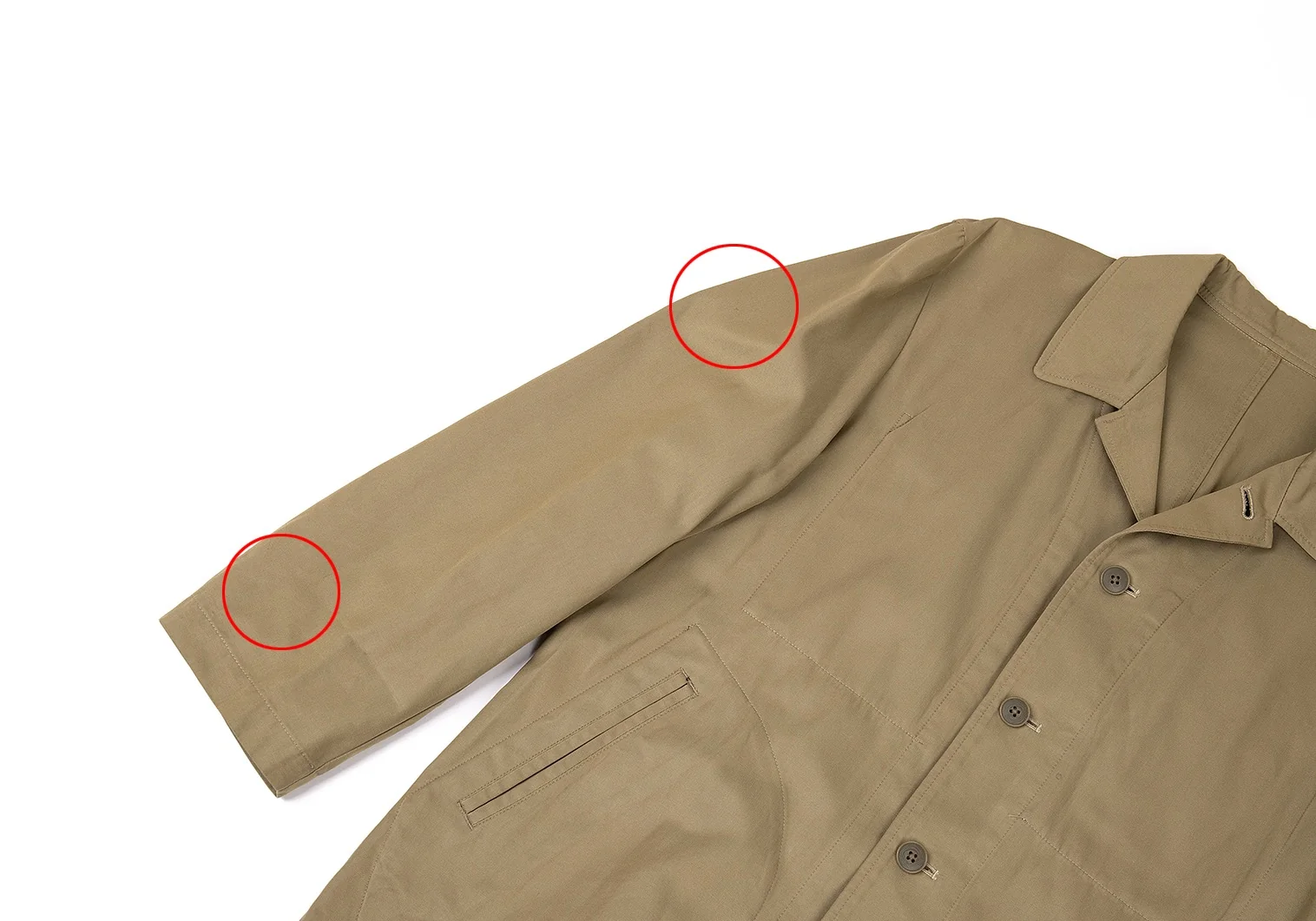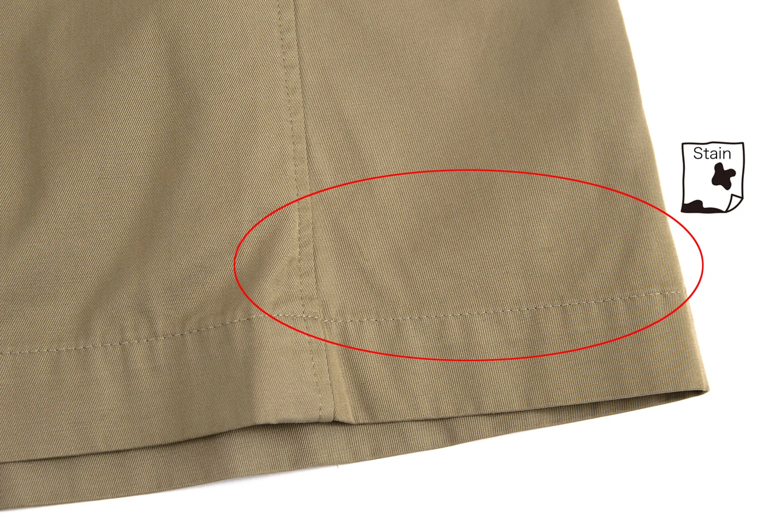 全体的に薄汚れあり、右袖にシミ・ペン汚れ、前立て裏に薄シミ、前身頃にシミ、背中・前後裾に薄汚れがあります。クリーニング済み