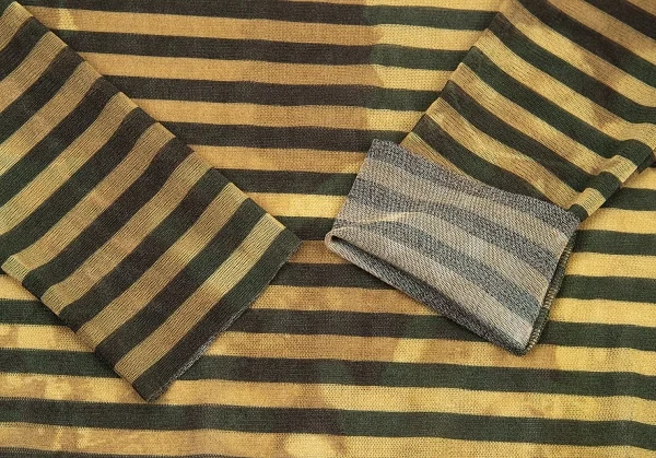品質表示タグがありません。透け感のある生地です。目立ったシミ、汚れ、ほつれ等なくいい状態です。クリーニング済み