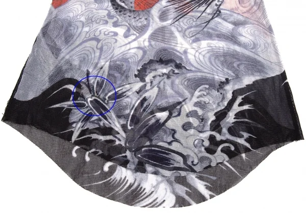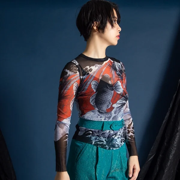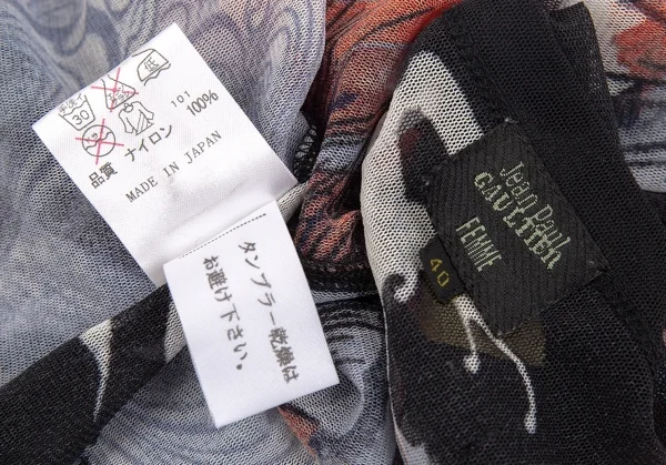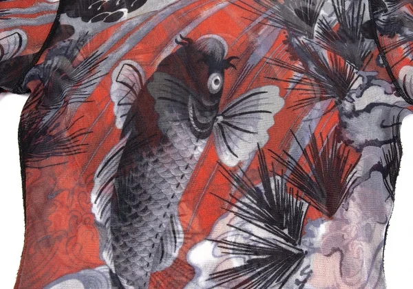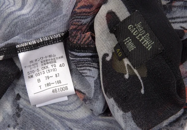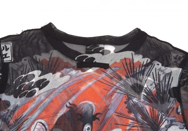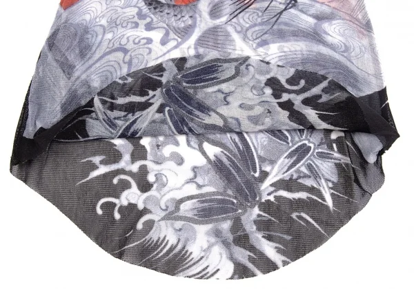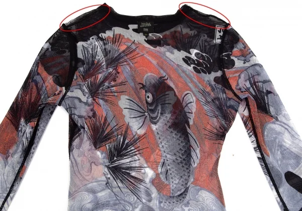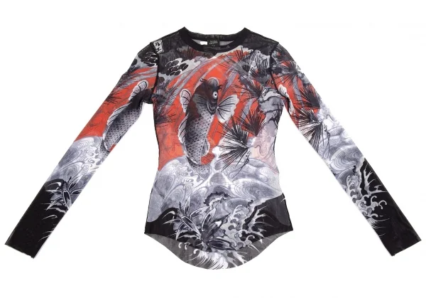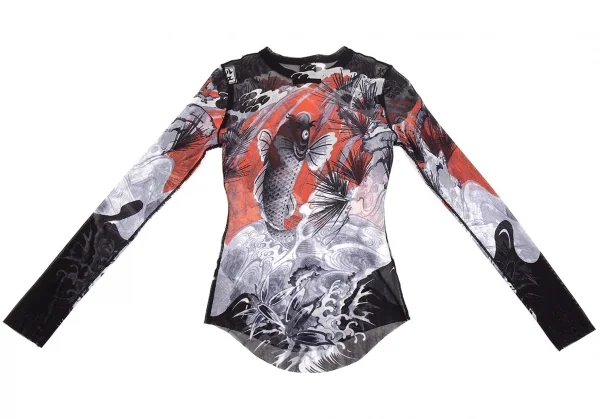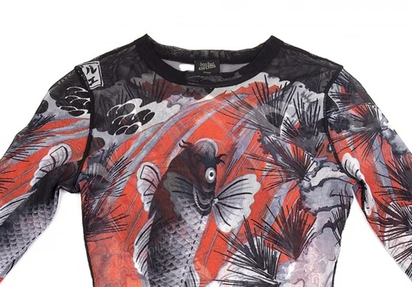ジャンポールゴルチエ ファムJean Paul GAULTIER FEMME 鯉の滝登りジャパニーズタトゥープリントパワーネットカットソー 黒グレー朱色40