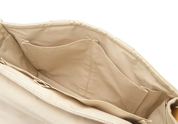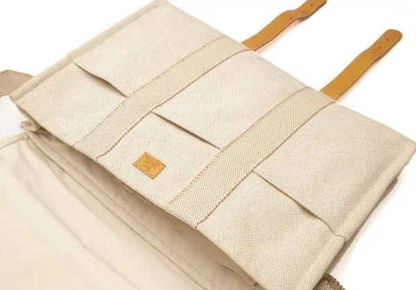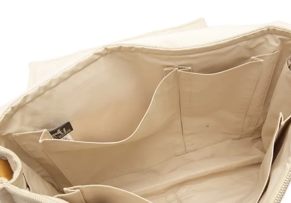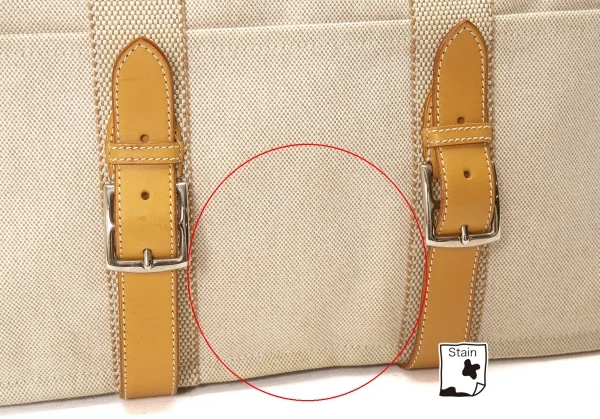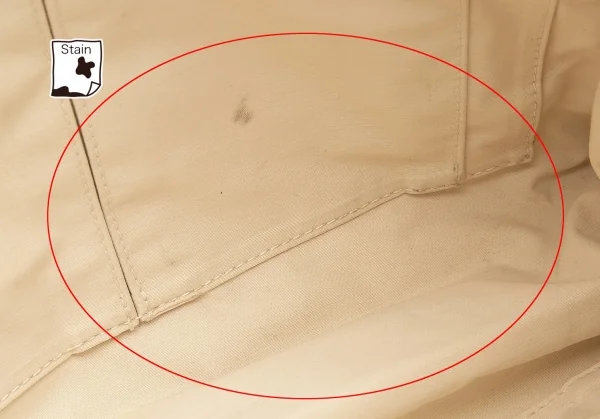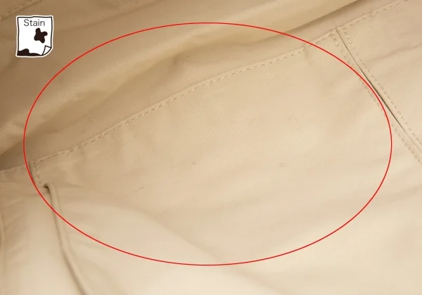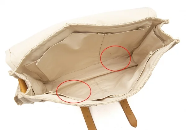 外側フラップポケット3つ、フラップ内側ポケット3つ、内側ポケット4つ。外側全体に黄ばみ汚れ、表面とショルダーに薄シミ、内側汚れがあります(写真参照)。クリーニング済み。