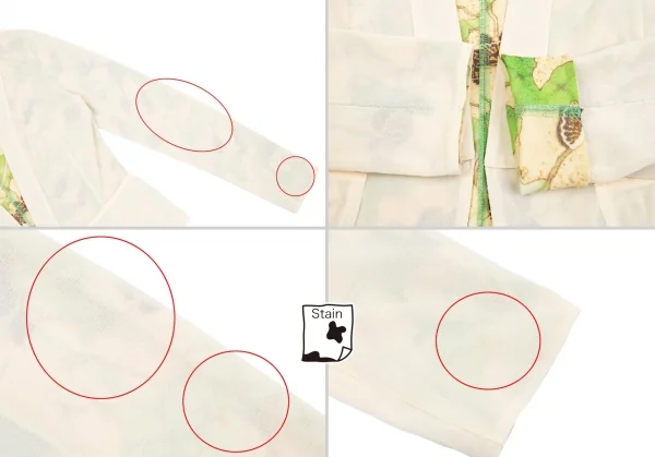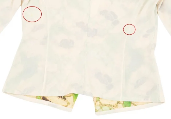 ベージュ側:左袖・背中にシミ、後ろ右脇下に小穴があります(画像参照)。その他目立ったシミ、汚れ、ほつれ等ありません。クリーニング済み