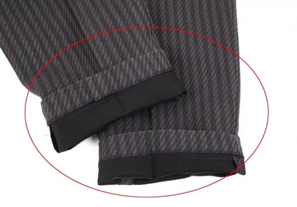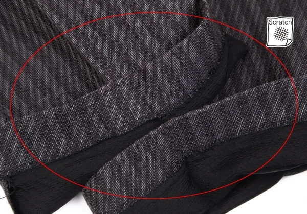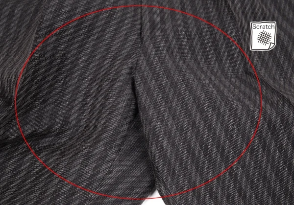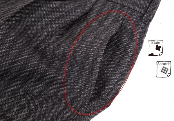 左ポケット口に毛羽立ち・薄シミ、股下に擦れ・毛羽立ち、裾先に擦れがあります(写真参照)。その他に目立ったシミ、汚れ、ほつれ等はありません。クリーニング済み